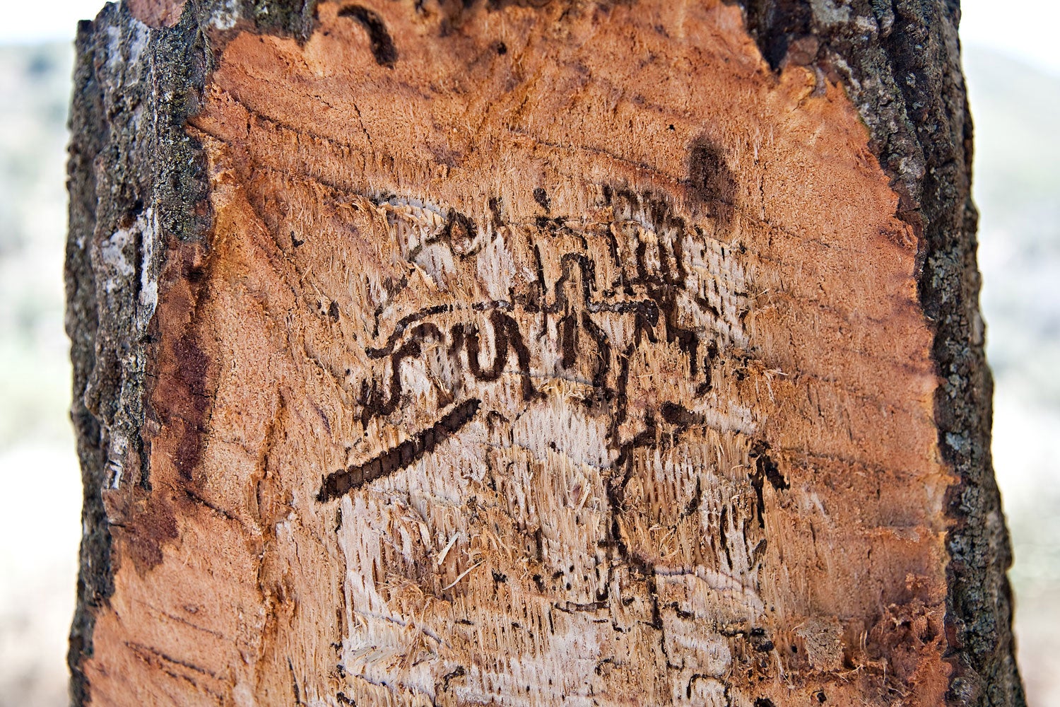 The cambium layer is a thin layer of generative tissue lying between the bark and the wood of a tree trunk. The cambium produces new layers of phloem on the outside and of xylem (wood) on the inside, thus increasing the diameter of the trunk. Feeding in this zone is concentrated in the lower parts of the main trunk and it is thought that larger branches may also be affected when GSOB populations are very high in trees. Feeding larvae kill patches of cambium, which eventually causes tree death when the trunk is heavily attacked in this manner. Removal of bark to reveal the cambium layer shows that larval GSOB feeding galleries are dark in color and have a meandering orientation (Fig. 8). Once the larvae are mature, they will tunnel to the underside of the bark where they will pupate before reaching adulthood. When adult development is complete, the adults chew an emergence hole through the bark and exit the tree.