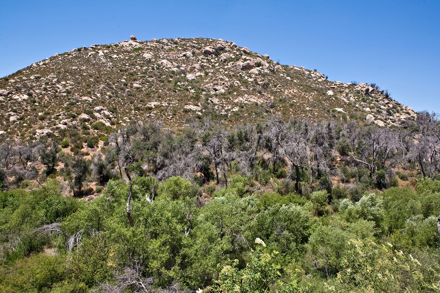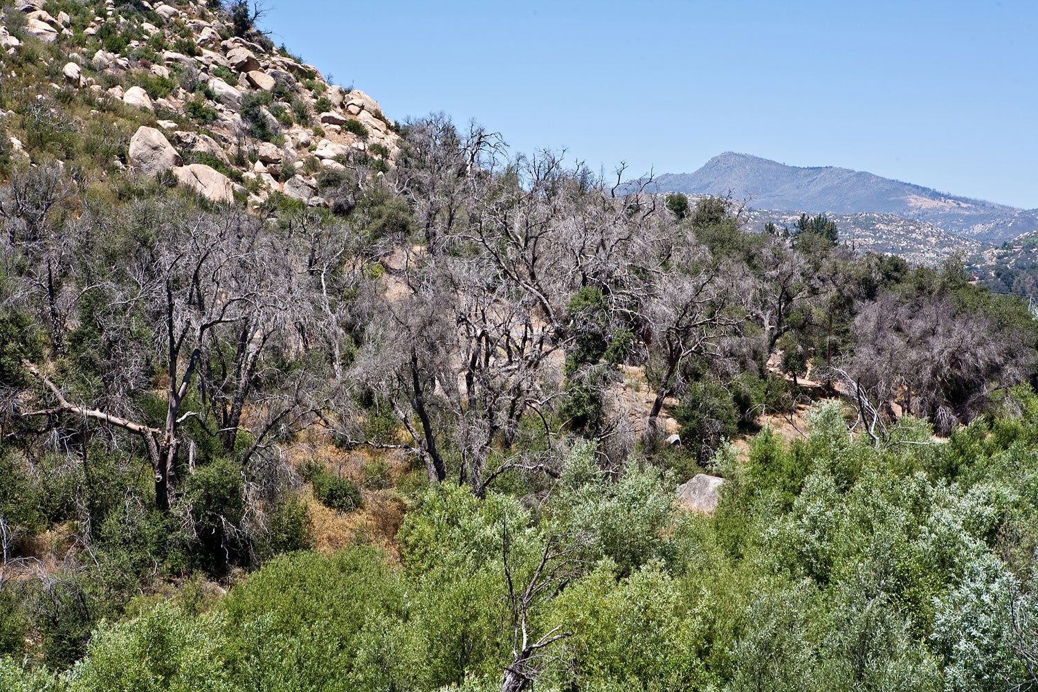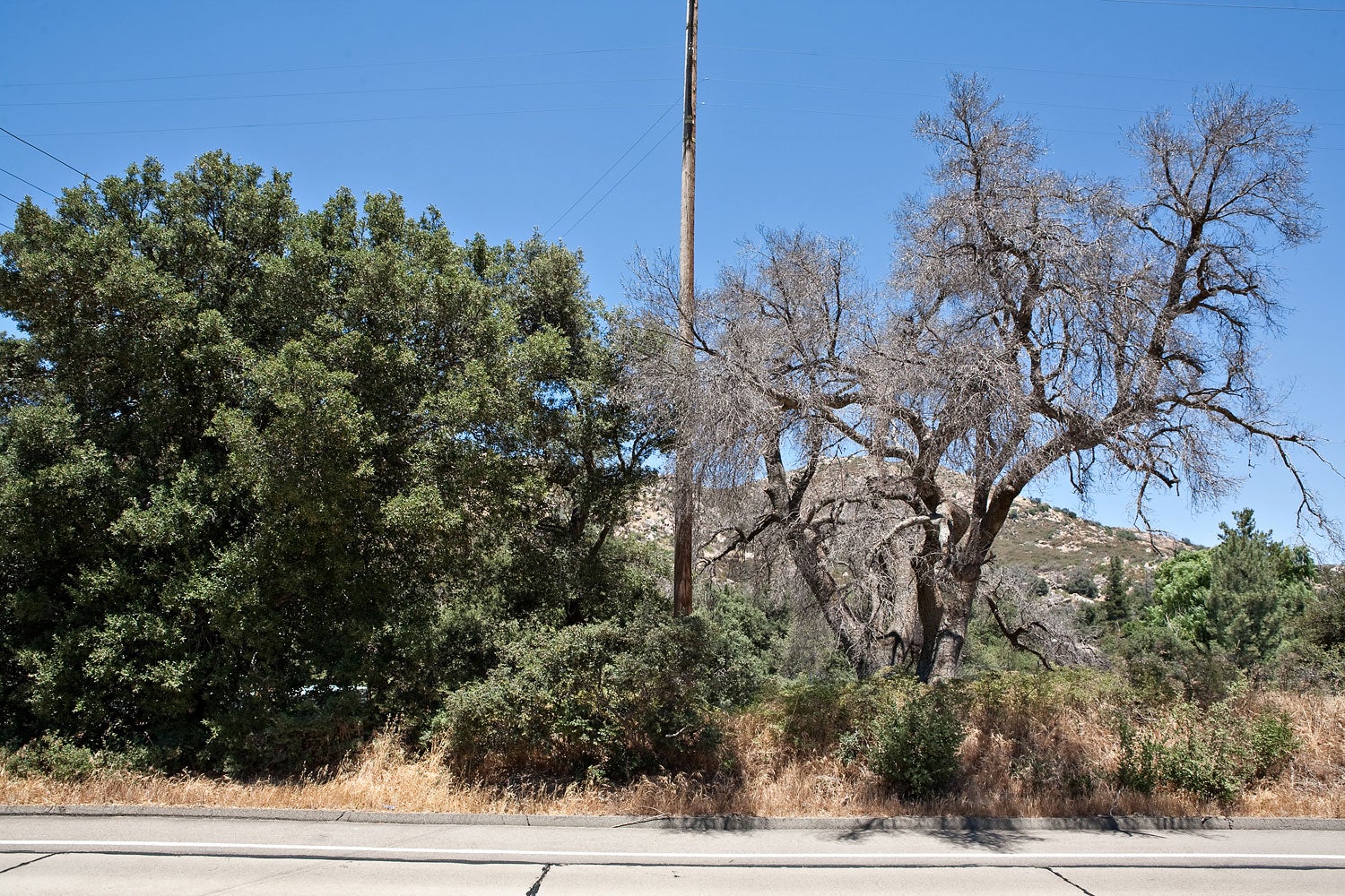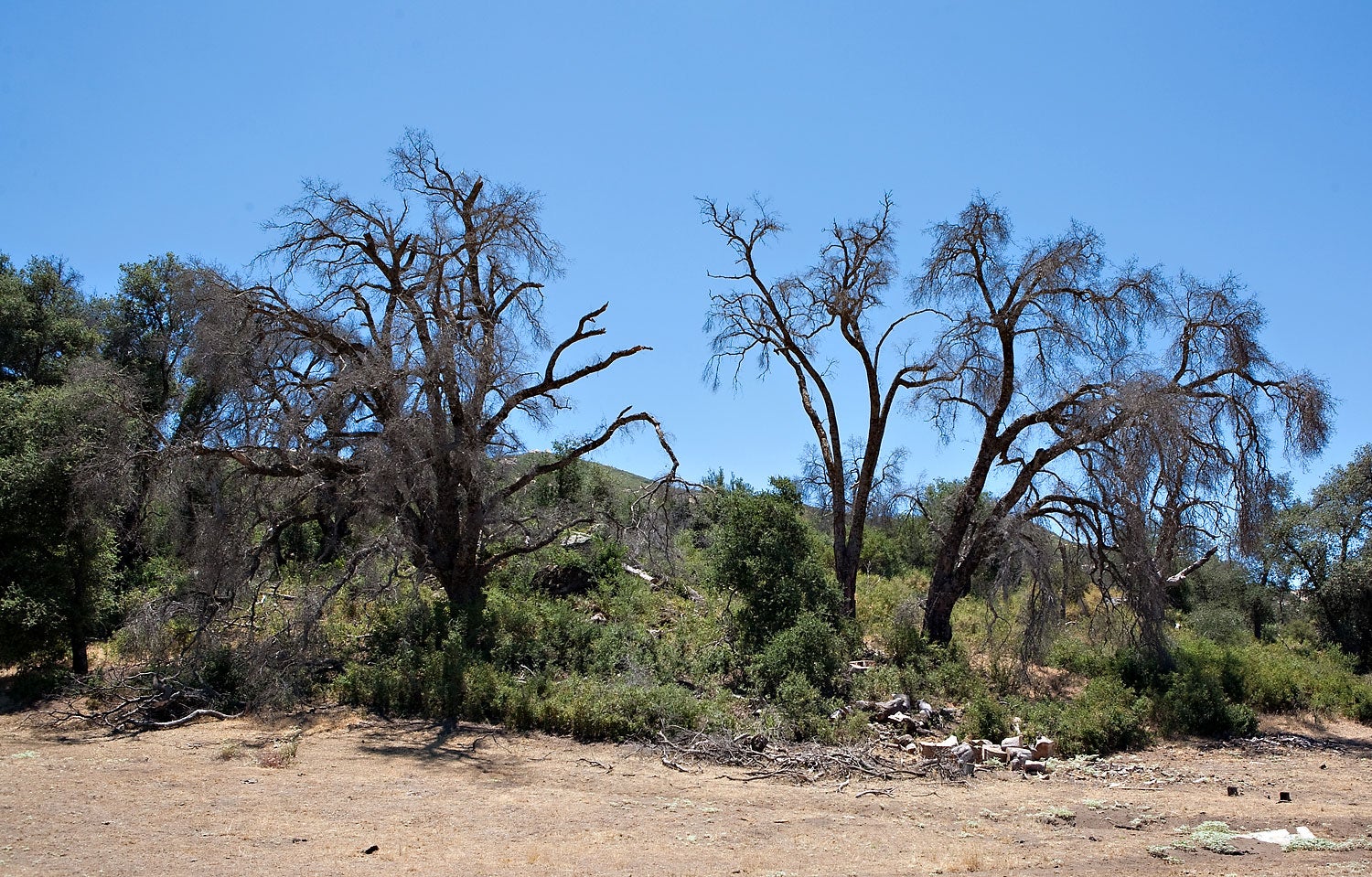Since oaks are keystone species in southern California’s woodlands, their widespread loss is also causing detrimental impacts to the natural landscape of this area. Biodiversity is adversely affected due to the loss of habitat and food resources used by native animals such as acorn woodpeckers, mule deer, ground squirrels, and the arroyo toad. Shading of sensitive riparian areas is being reduced which threatens water supplies and the existence of animals and plants that rely on this scarce resource. Also, increasing numbers of dead oaks are significantly increasing the fuel load in these areas, which can increase the probability and severity of wildfires in these natural areas. And lastly, there is a cost associated with the loss of aesthetic value because large swaths of dead oaks are ugly to look at and the attractiveness of these afflicted areas for hikers, photographers, and tourists is greatly diminished. Although this cost is difficult to estimate, it is nevertheless present, and possibly quite high.