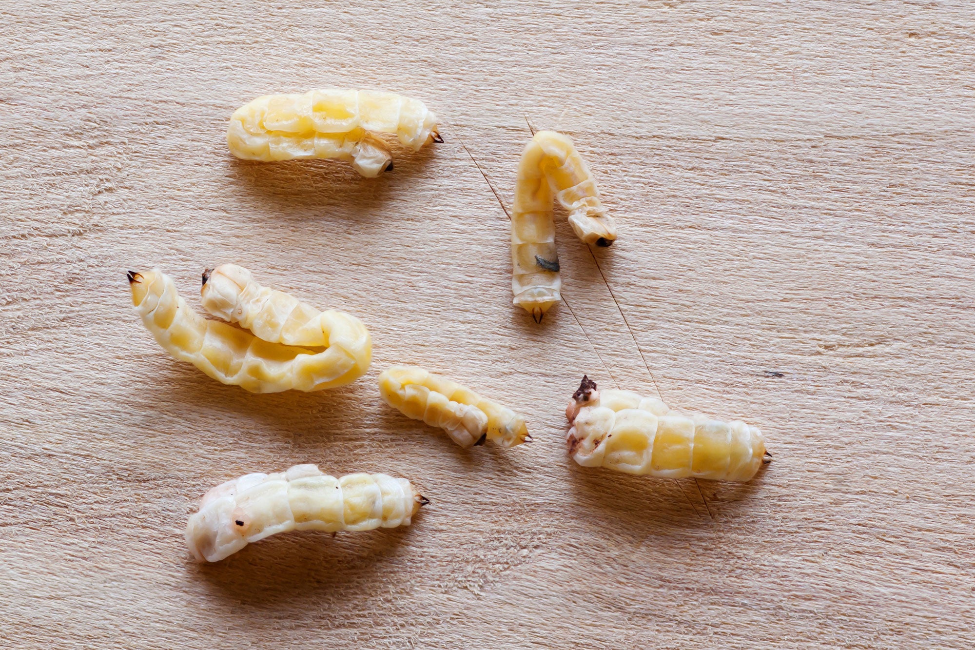 have a bulbous head with hardened mandibles which are used for boring into bark and phloem, and they possess two pincher-like spines at the tip of the abdomen. This is a very important and characteristic feature that separates GSOB larvae from other beetle larvae (e.g., cerambycids) that may also be found feeding inside oaks.
