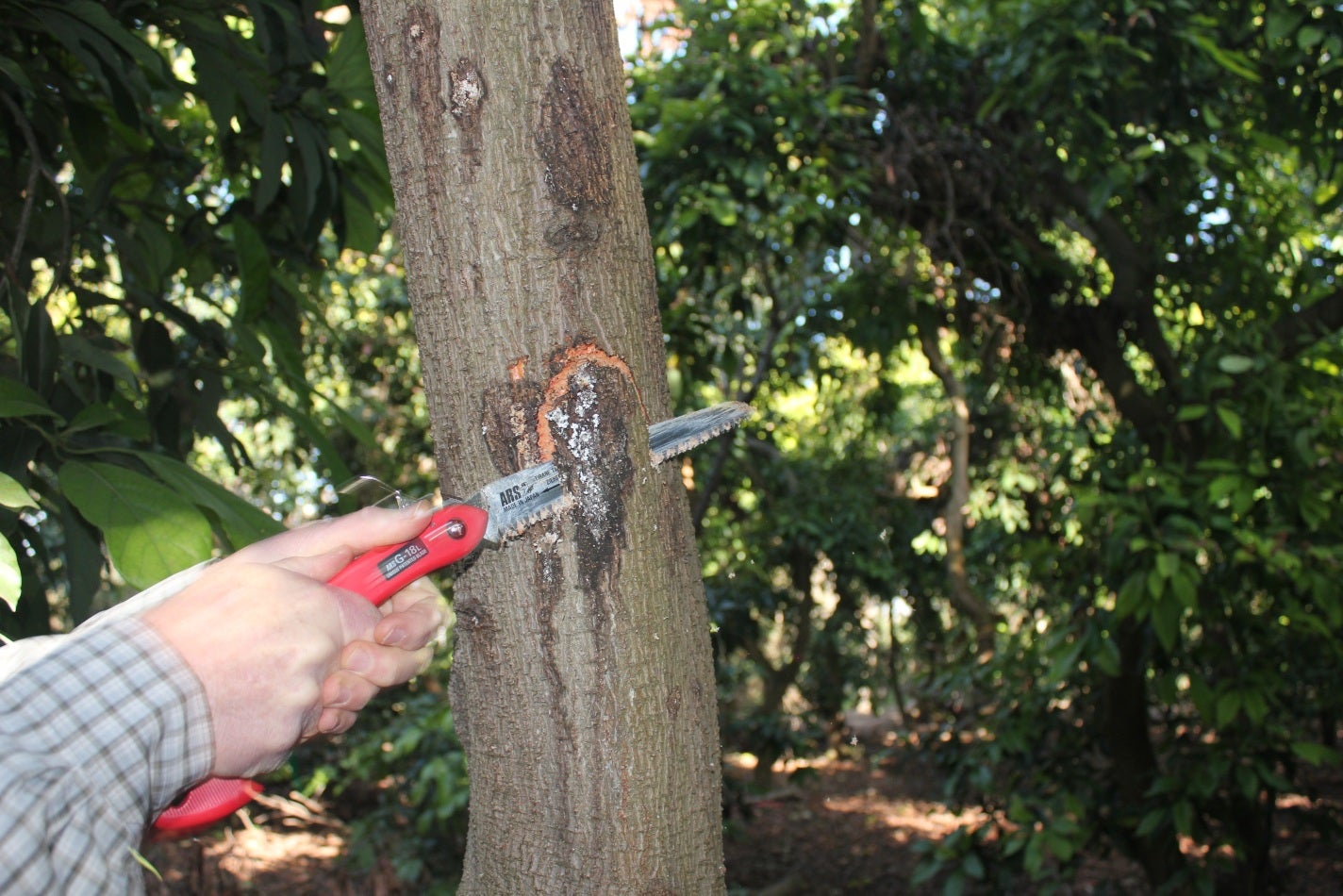 Spread in California: Both the fungus and the beetle were found on several backyard avocado (cv. Hass, Bacon, Fuerte, Nabal) trees in residential neighborhoods and commercial avocado groves in South Gate, Downey and Hacienda Heights, and several public arboretums in Los Angeles and Orange Counties.