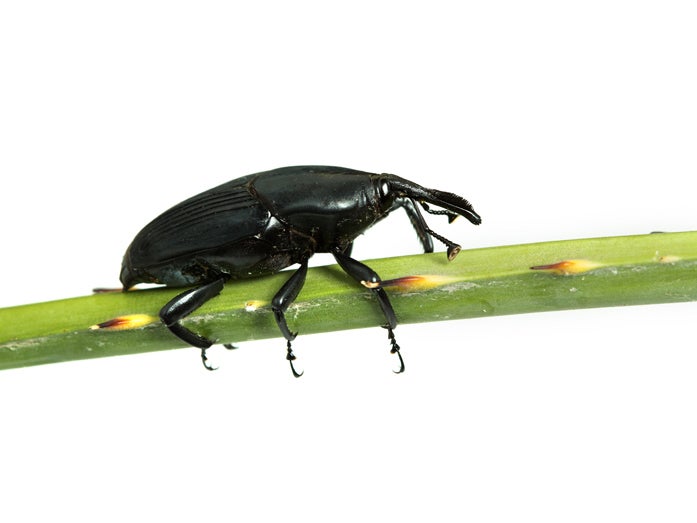Symptoms: Early Red Palm Weevil infestations can be difficult to detect in large palms in the landscape unless access to the actively growing portions can be attained. It is important that arborists and individuals working in palm canopies be vigilant for signs of larval mines and frass (excrement) in leaf bases in the central growing point of the palm in order to detect signs of early infestation. Larval damage to leaf bases anywhere in the canopy revealed by routine trimming may also be a sign of feeding by young Red Palm Weevil larvae. Dieback in the apical (newest, uppermost, or center) leaves in the canopy is a common symptom of larval damage to the meristem tissue and should be investigated for RPW. Frass accumulating at points of injury or at the base of offshoots may also appear in infested trees. Adult weevils are strong fliers and would appear in flight as one of the larger beetles to occur in California urban landscapes.