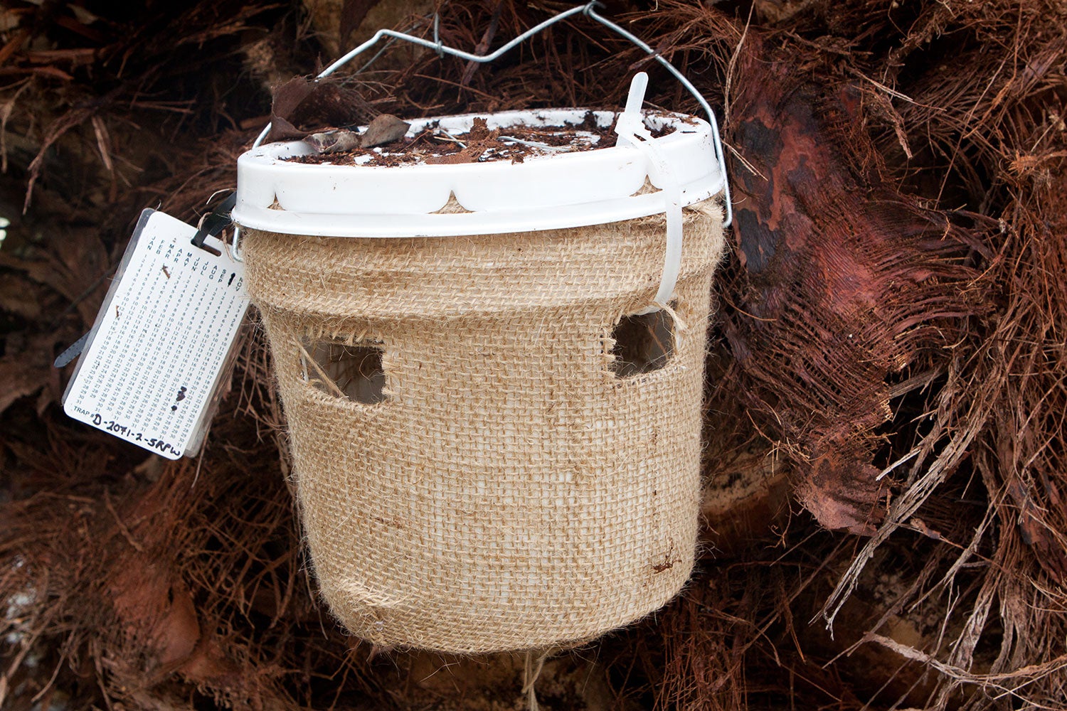 Monitoring for Red Palm Weevil Populations in California: In response to the RPW collection in Laguna Beach, state and federal survey crews deployed pheromone baited traps. Pheromones are airborne chemicals that elicit behavioral or physiological responses in insects. RPW is highly attracted to two different types of odors: (1) volatiles emanating from unhealthy or damaged palm trees, and (2) aggregation pheromones (commercially available) which male weevils release to attract other male and female weevils to palm trees that are suitable for weevil larvae to use as food. Neither the stressed palm odors or the weevil aggregation pheromone are very effective on their own. However, in combination they can be powerful in attracting weevils to traps. Pheromone traps make it possible to detect very low density pest populations that would otherwise be almost impossible to find.