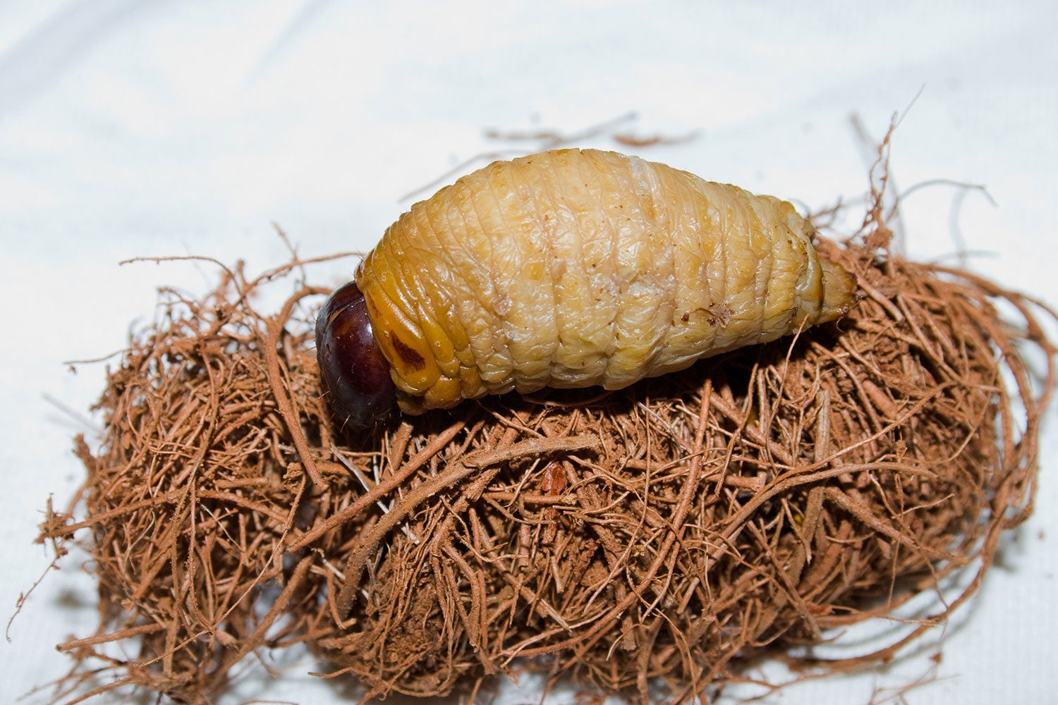 Life Cycle: To lay eggs, females use their long beak, or rostrum, to chew a hole into palm tissue. Eggs are then laid into this hole. Eggs may be laid in wounds, cracks, and crevices in the trunk, from the collar region near the roots, up to the base of frond petioles and axils near the crown of the palm. Females can lay 58-531 eggs which hatch in about 1-6 days. Larvae that hatch from eggs, feed on the surrounding palm tissue and bore their way into the center of the palm. The tunnels larvae form as they feed fill with frass (excrement and chewed fibers that have a highly distincitve odor) and plant sap. Larvae may pass through 3-7 instars or stages that may last for about two months before the pupal stage is reached. Larvae pupate inside cocoons in the palm trunk, or in concealed places at the base of palm fronds. The pupal stage may last from 11 to 45 days. The entire life cycle, egg to adult, can take 45 to 139 days. Adult Red Palm Weevil emerge from cocoons, and females can lay eggs for around 8 to 10 weeks. Adult weevils live for about 2 to 3 months feeding on palms, and going through several cycles of mating and egg laying before dying. The sex ratio is slightly biased towards females (1 male to about 1.2 females). In Egypt, it has been estimated that RPW can have up to 21 generations per year. This pest can be reared in the laboratory on sugar cane, and a variety of artificial diets.