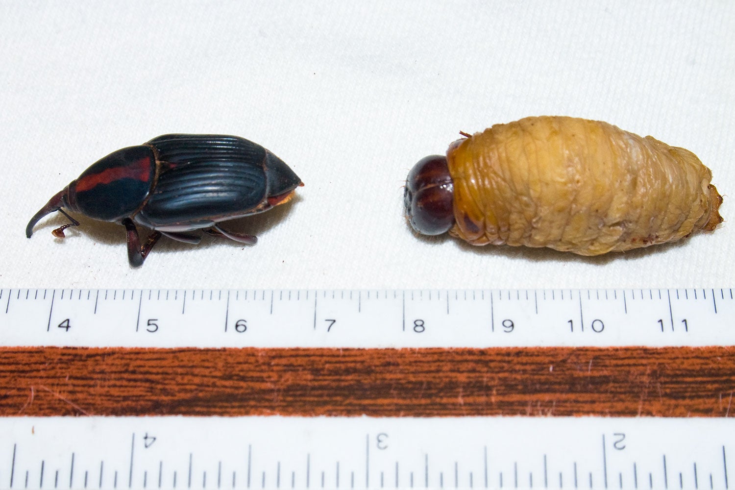 Identification: Adult Red Palm Weevils are very large beetles, attaining body lengths, including the rostrum of 35 to 40mm (1.4-1.6 inches). The weevils have a long, slender rostrum or “snout” which the female uses to penetrate palm tissue and create access wounds in which eggs are deposited. Coloration in Rhyncophorus ferrugineus is extremely variable and has historically led to the erroneous classification of color-defined polymorphs (variants) as distinct species. Coloration in the adult weevils is predominately reddish-brown in the most typical form. The Red Palm Weevil’s collected in Laguna Beach have displayed a distinct “red striped” coloration which consists of the dorsal surfaces appearing uniformly dark brown to black, with a single, contrasting red stripe running the length of the pronotum. Consequently, there are two different color types or color morphs for RPW, adults that are predominantly reddish in color, and the others that are dark with a red streak, like the Laguna Beach specimens. The Red Palm Weevil, like other beetles, develops through complete metamorphosis, with larvae and pupae developing within the trunk and apical growth tissues of the palm meristem. Larvae are legless grubs with the body color uniformly pale yellow with a brown head. Larvae may attain lengths greater than 50 mm (2 inches). Larvae feed within the soft tissues of the meristem or leaf bases creating frass filled mines, enlarging and penetrating deep within the upper trunk areas as the larvae mature. Mature larvae construct a pupal chamber or cocoon made up of coarse palm fibers in which they pupate and occupy for approximately three to four weeks. The cocoons are located within the damaged tissue of the palm.
