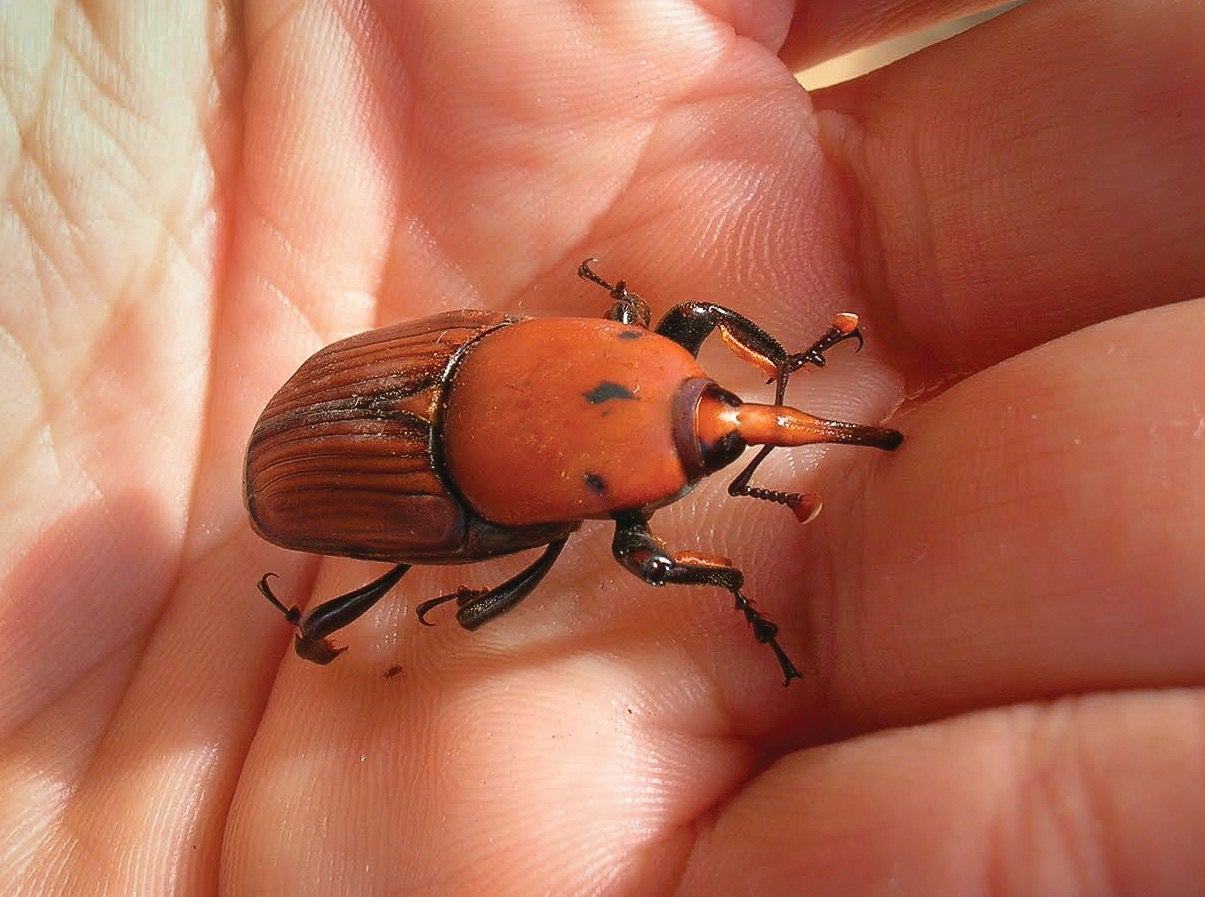 The Situation: During August 2010, arborists removed a large dying Canary Island date palm (Phoenix canariensis) from a residence in the city of Laguna Beach, Orange County, California and reported finding adult weevils and weevil larvae with associated larval feeding damage in the top portions of the palm trunk. The weevils were subsequently identified as Rhynchophorus ferrugineus, the Red Palm Weevil (RPW), by experts at the USDA-ARS Systematic Entomology Laboratory in Maryland. This was the first record of this pest in the USA.