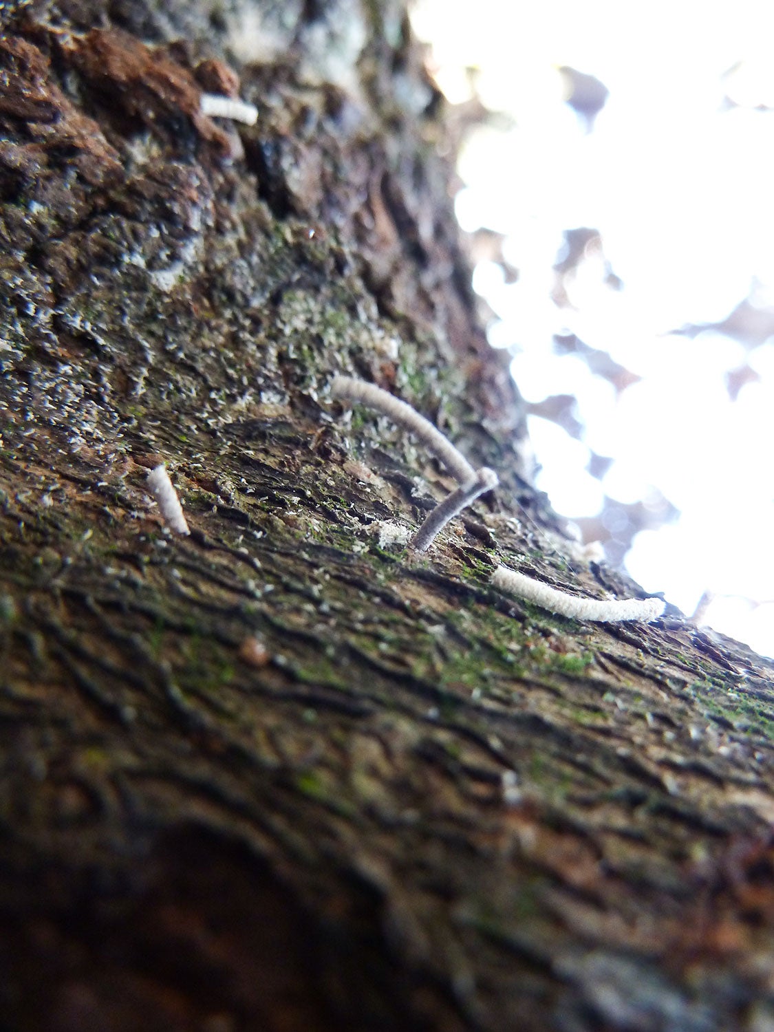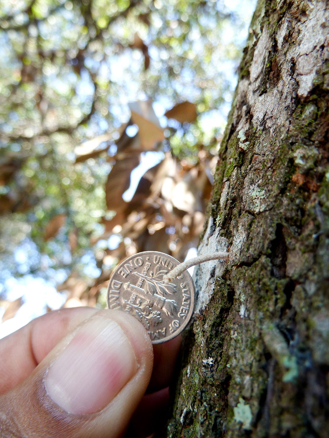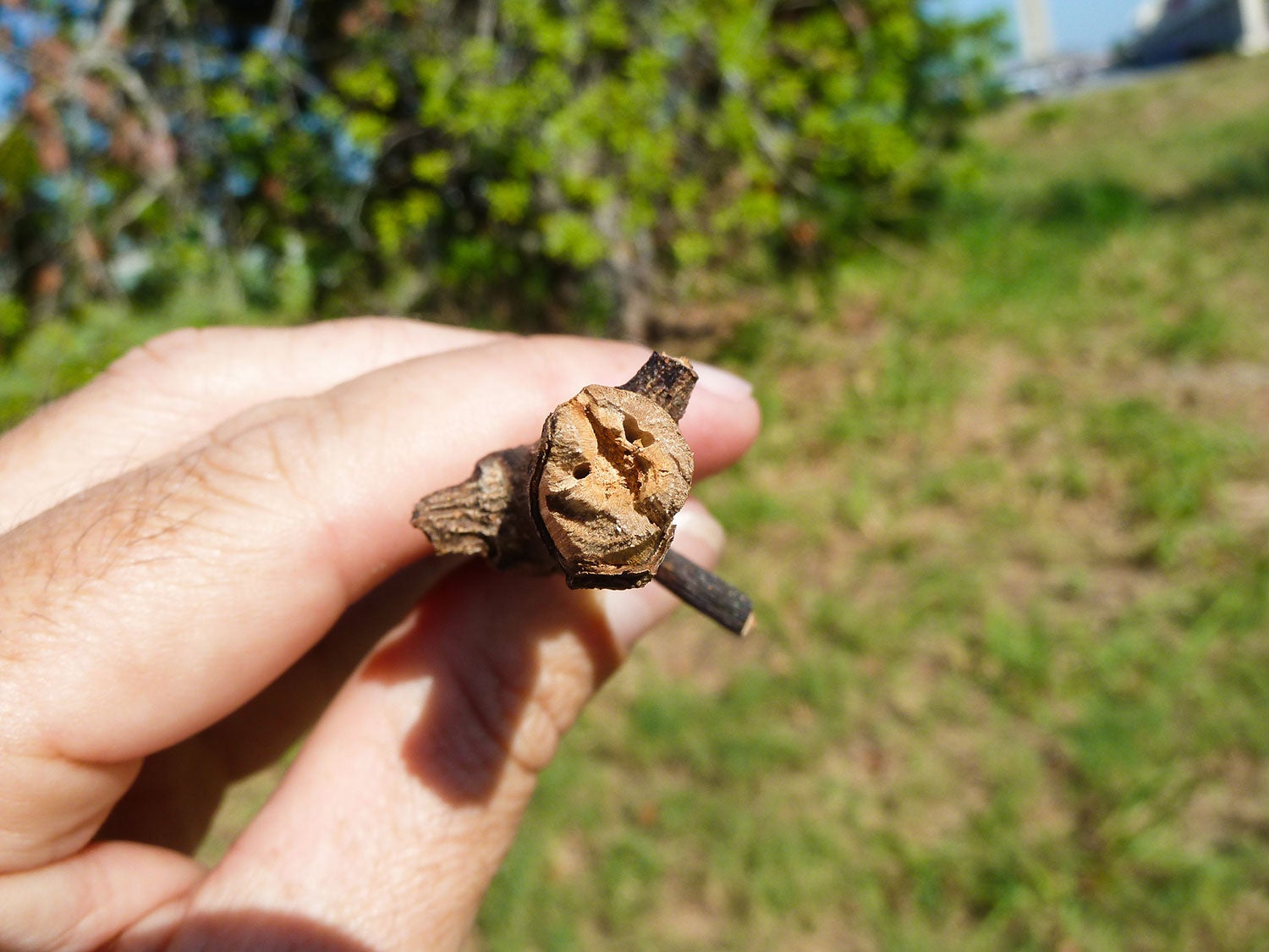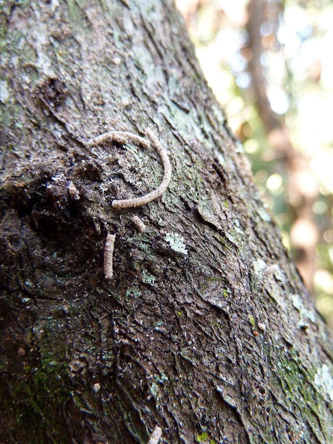 Damage: Damage to trees infested with redbay ambrosia beetles is identifiable by the emergence of saw dust tooth picks that radiate from the trunks and branches of infested trees. These toothpicks are the frass or excreta of feeding beetles being pushed out of feeding galleries. Examination of the inside of the trunk will reveal bluish staining caused by the laurel wilt fungus. When taken together, the appearance of tunnels, tooth picks, and bluish staining is strongly suggestive that a tree is infested with beetles and fungus, especially if the host plant is a member of the Lauraceae.