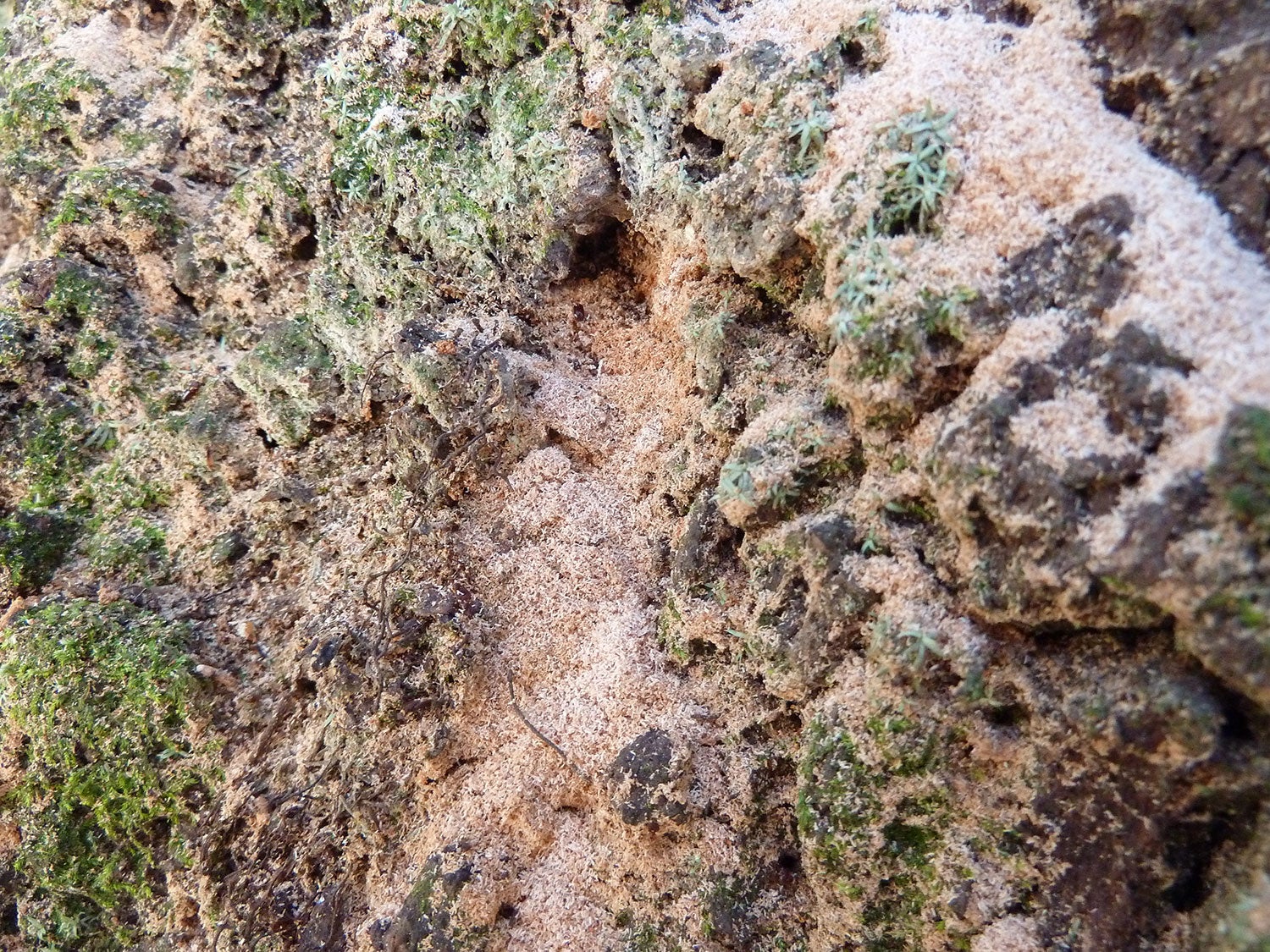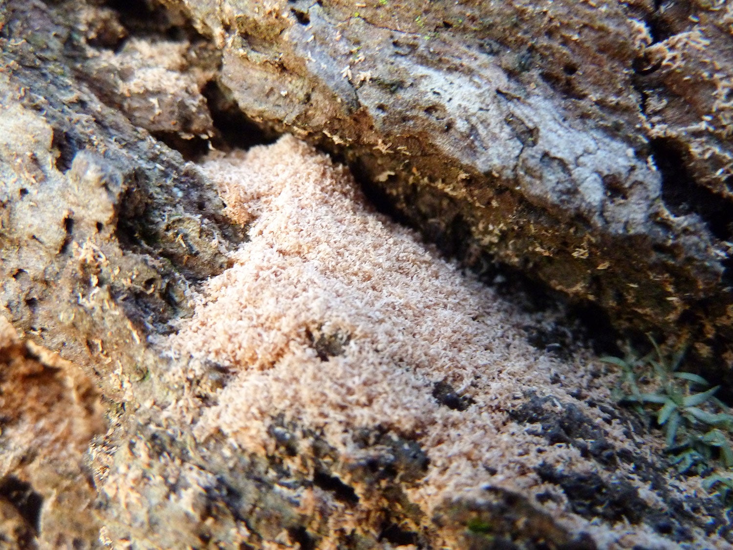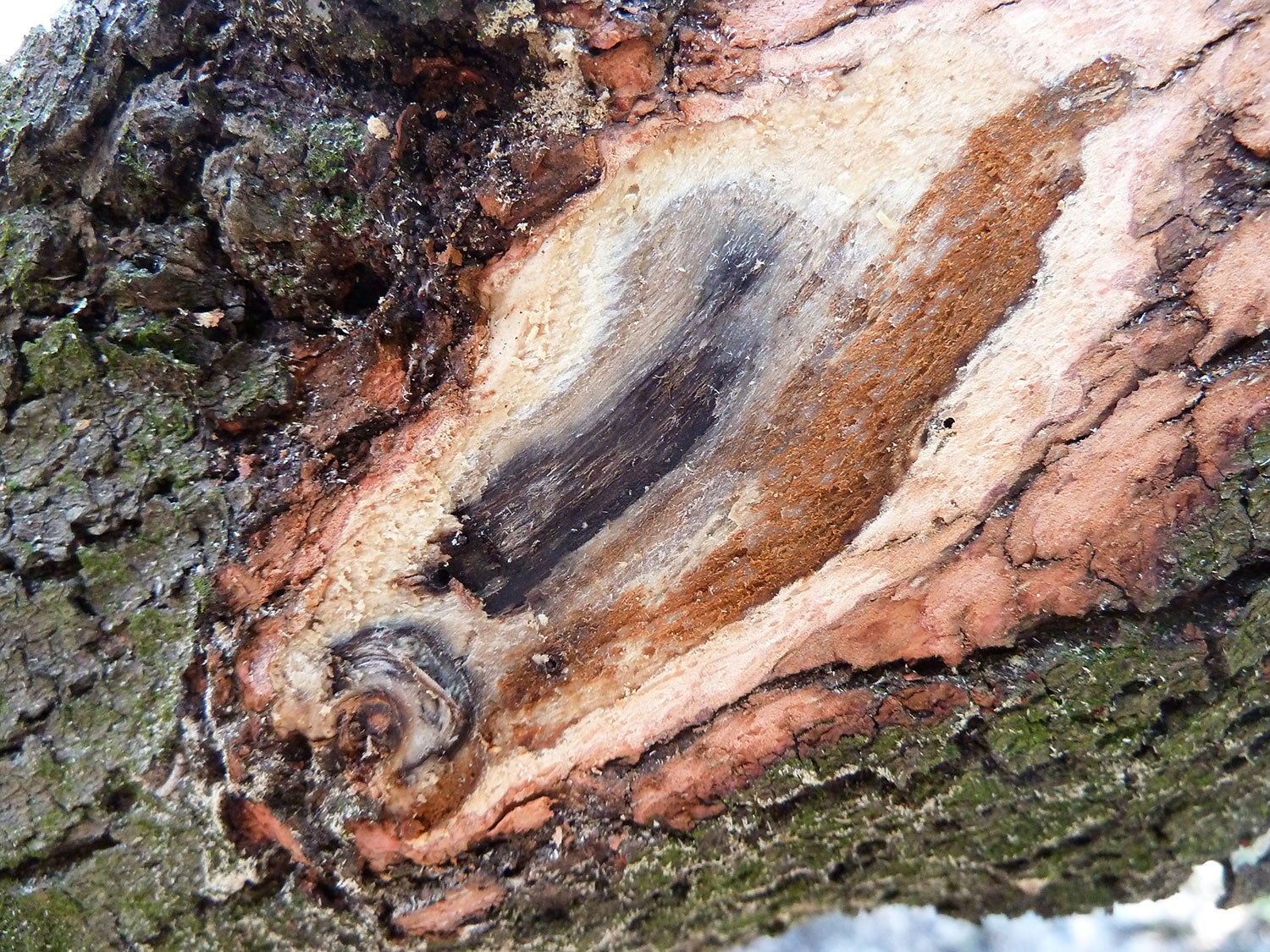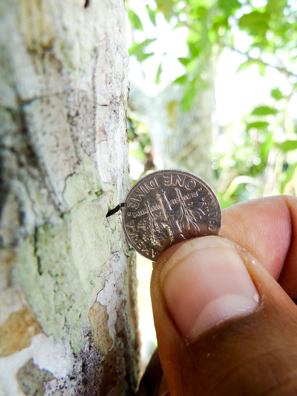 Damage: Damage to trees infested with redbay ambrosia beetles is identifiable by the emergence of saw dust tooth picks that radiate from the trunks and branches of infested trees. These toothpicks are the frass or excreta of feeding beetles being pushed out of feeding galleries. Examination of the inside of the trunk will reveal bluish staining caused by the laurel wilt fungus. When taken together, the appearance of tunnels, tooth picks, and bluish staining is strongly suggestive that a tree is infested with beetles and fungus, especially if the host plant is a member of the Lauraceae.