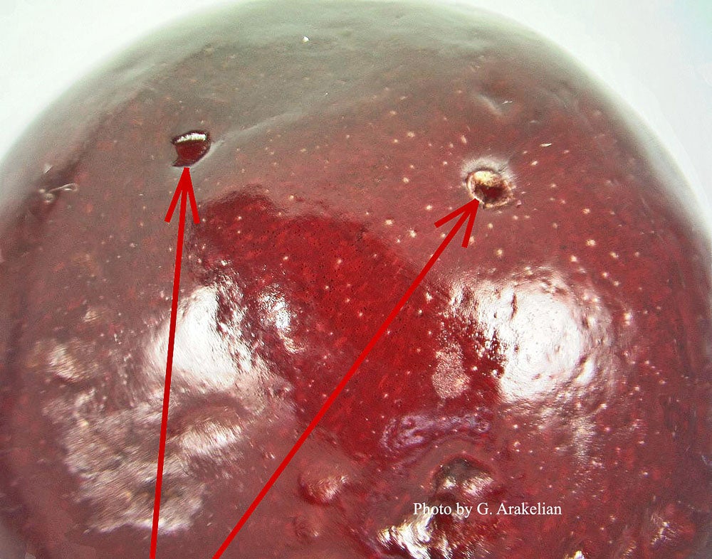 The Problem: This fly causes economic damage berry crops, in particular fresh cherries, strawberries, raspberries, blackberries, and blueberries. It may also attach grapes, and perhaps some stone fruits, however this is not certain. Damage to berries is caused by white legless maggots feeding internally on fruit pulp. Female flies use their ovipositor, a type of egg laying tube, to puncture or "sting" the skin of healthy growing berries and the egg is inserted into this wound. Fluids may leak from this puncture, and often rot-type pathogens will enter the wound also causing damage. Spotted wing drosophila has short generation times. It has been estimated that during cherry fruiting season the fly may have up to 2-3 generations, and over the course of the year, perhaps as many as 10-15, depending on location and local climatic conditions. Prolonged temperatures around or in excess of 30oC (86oF) may be detrimental to fly populations.