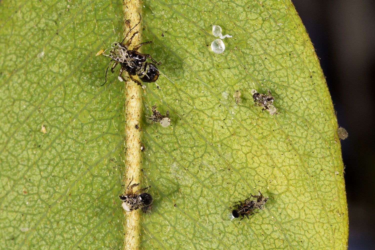 Damage: Tipu psyllid nymphs and adults nymphs are tiny insects that feed on phloem. All life stages (except eggs which are non-feeding) attack young leaves and branches of Tipu trees. Extensive feeding causes the leaves on host plants to curl and drop prematurely. Nymphs produce pelletized wax-like residue. Adults and nymphs produce copious amounts of honeydew which fosters the growth of black sooty mold on leaves and branches. The wax pellets produces by nymphs are very similar to those seen in the Eugenia psyllid, an exotic pest from Australia that attacks Eugenia and Syzigium in California. Tipu psyllids feed exposed, without the protection of flocculent waxes or pit like depressions in leaves.