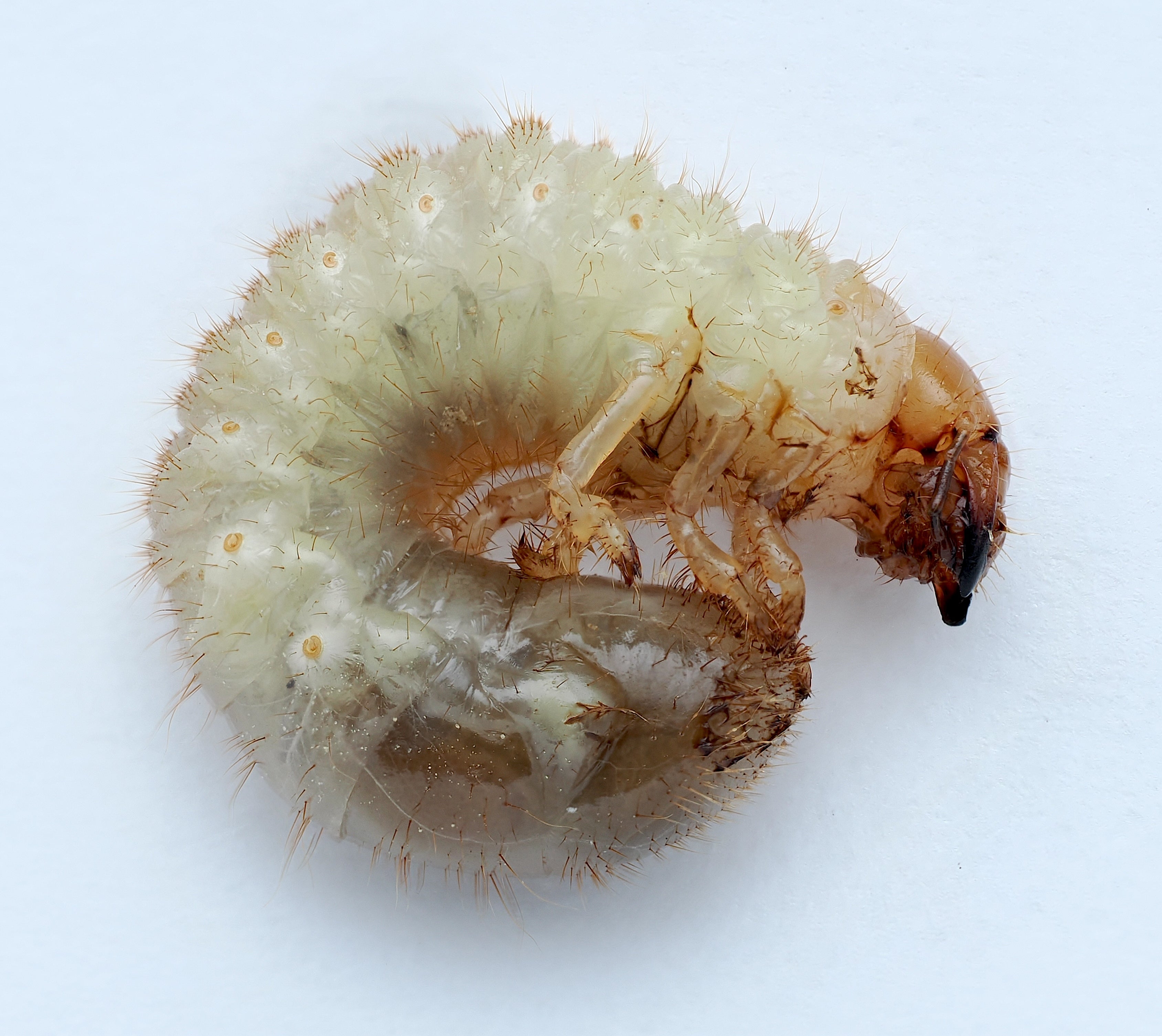 Identification, life cycle, and damage: Japanese beetle adults are small, approximately 10 to 15 mm in length, with metallic green bodies and brown wings. They should not be confused with other brightly colored scarab beetles, such as the green fruit beetle (figeater beetle), which are much larger and are endemic in parts of California. The life cycle of P. japonica generally consists of a single generation each year, the bulk of which is spent underground. Mated females burrow into the soil and lay upward of a few dozen eggs beneath the soil surface, often clustering them near plant roots. After hatching, larvae (grubs) feed on roots and underground stems of plants. Larvae are tan or yellowish in color and reach approximately 1 cm in length before developing into pupa. Adults, which emerge from late Spring through Summer, are gregarious and feed especially on leaves and blossoms.