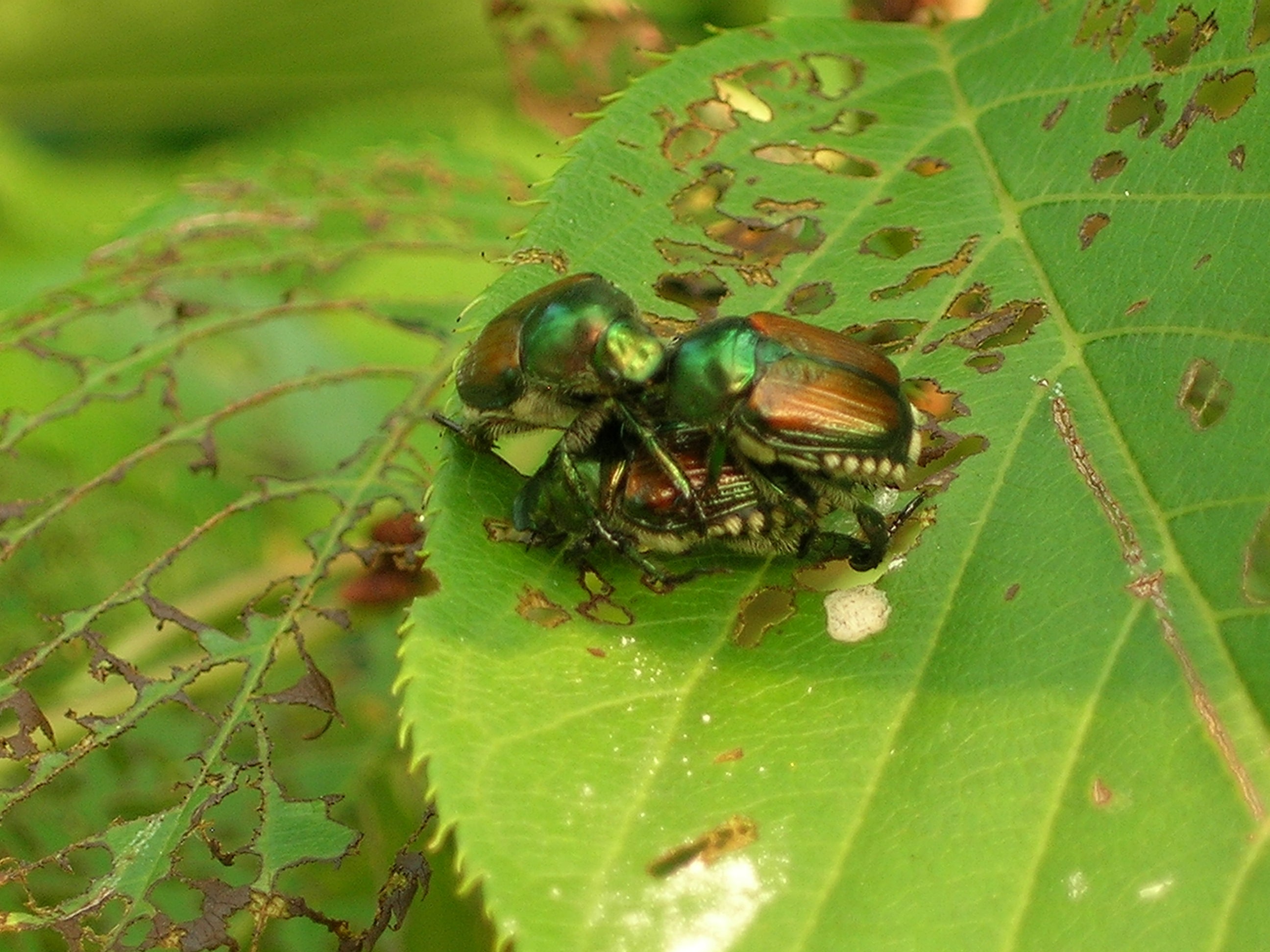 Japanese beetle is reported to use more than 300 species of native trees and shrubs, fruit trees and vines, ornamental plants, vegetable crops, and grasses. Common hosts include several berries, stone fruit, grapes, legumes, corn, and turfgrass. Both larvae and adults can cause severe damage. Adults primarily feed on leaves, flowers, and overripe fruit – leading to severe skeletonizing of leaves and reductions in yield. Larvae feed on roots, especially in turfgrass, reducing the plant’s absorption of water and nutrients. Larval damage to lawns, parks, and golf courses can be severe, and likely accounts for a significant fraction of the estimated $450 million in management costs each year in the US.
