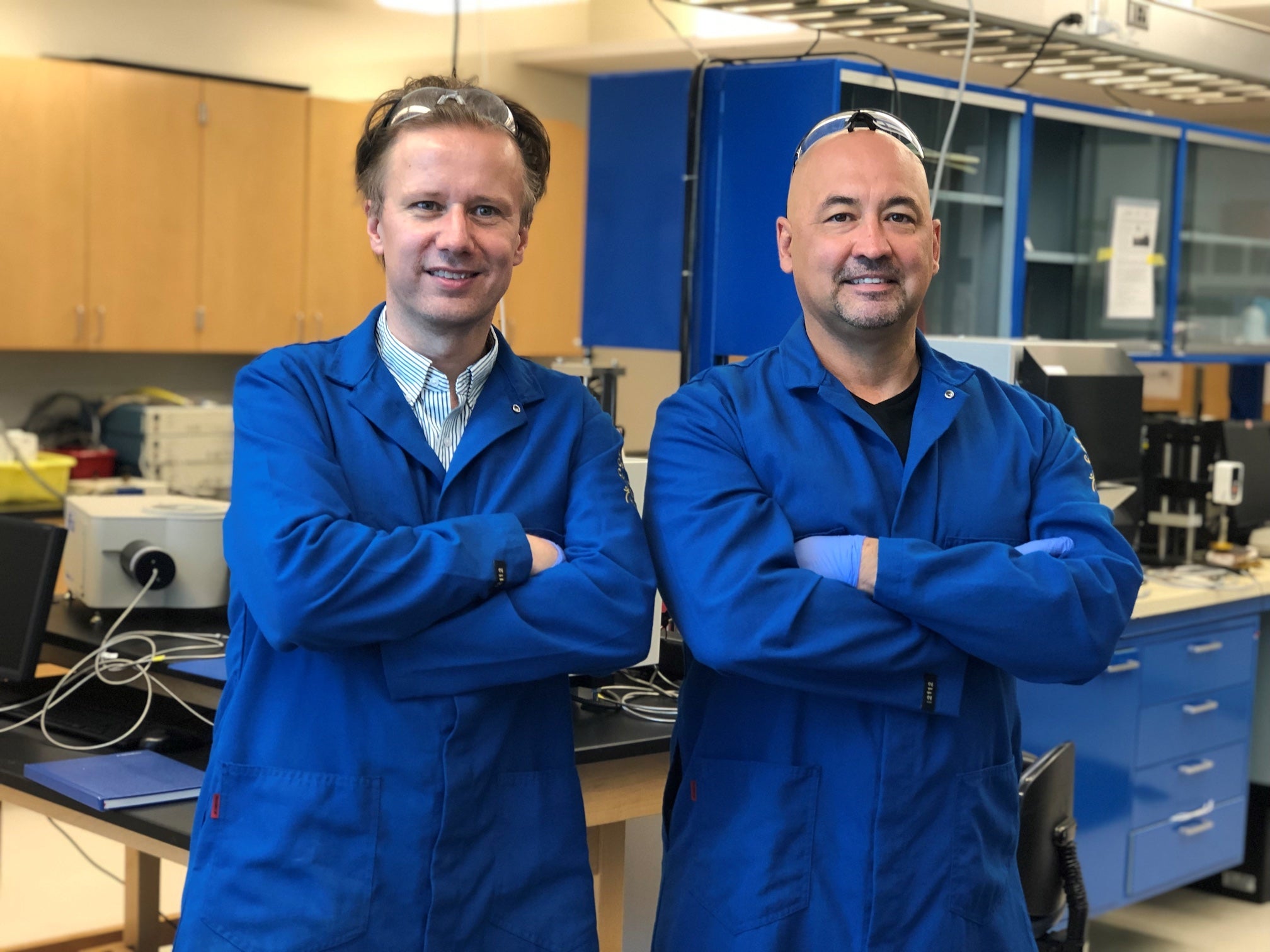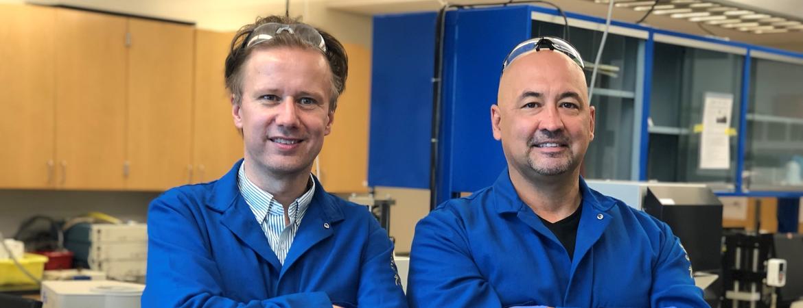 Ludwig Bartels (left) and Alexander Balandin (right) in the Phonon Optimized Engineered Materials (POEM) Center at UC Riverside, 2019