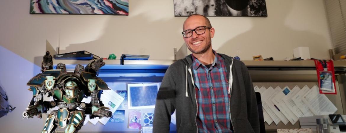Nathaniel Gabor spends his free time building and intricately painting scale models for the tabletop game "Warhammer," like the sculpture of a 'titan' seen above.