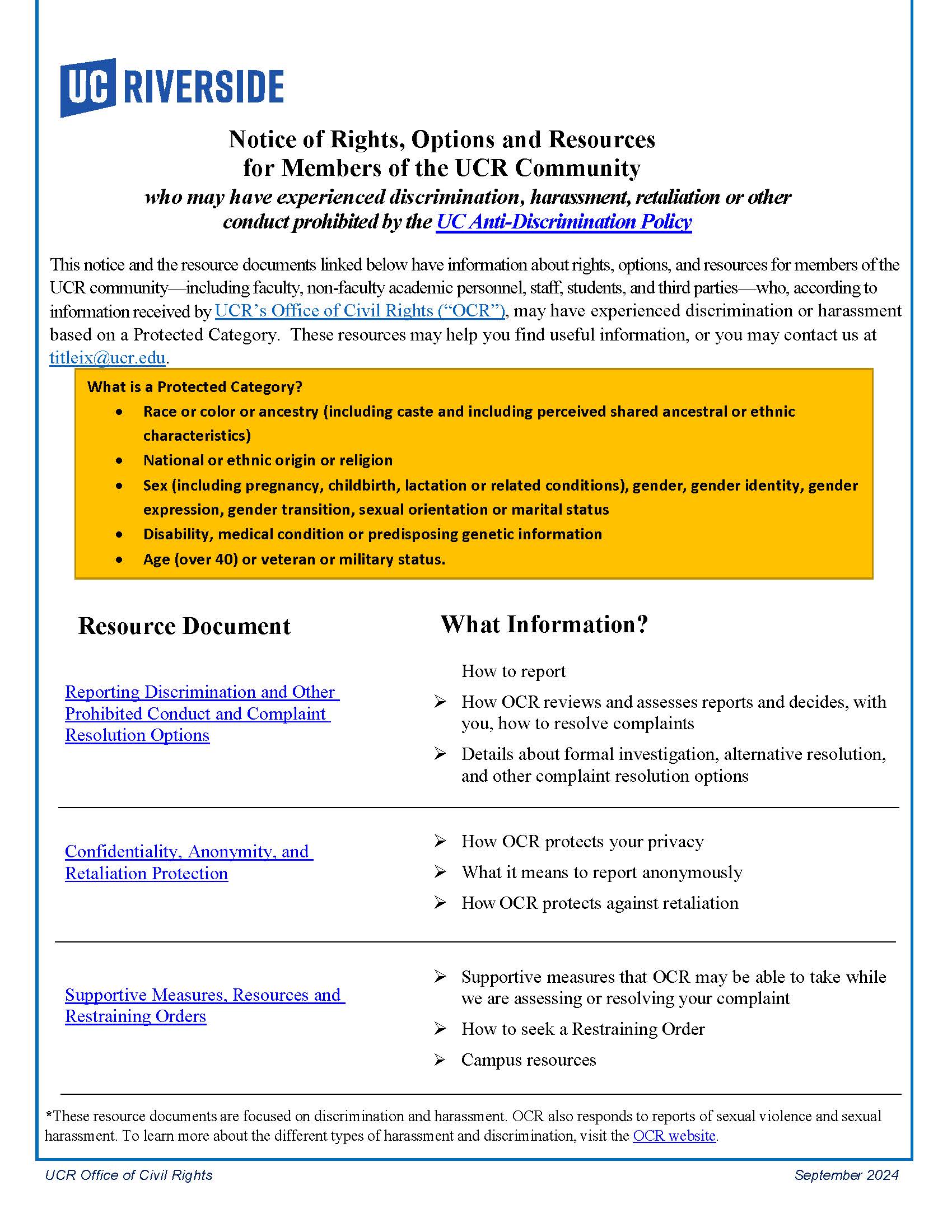 If you have experienced discrimination or harassment based on a Protected Category (listed on our main office website), or any other violation of the Anti-Discrimination Policy, the Notice of Rights, Options & Resources is a one-page collection of important resources and information.