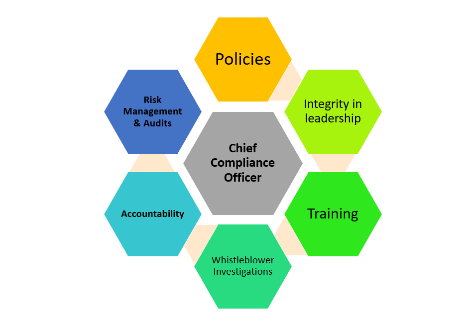 The 7 elements of a compliance program include: policies, integrity in leadership, training, whistle blower investigations, accountability, risk management & audits.