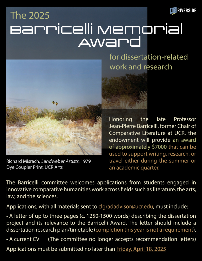 Established in 1997 to honor Dr. Jean-Pierre Barricelli, the grant encourages highly motivated students to pursue comparative studies in literature and another discipline. Awardees receive research support for one quarter and the honor of delivering the Annual Barricelli Public Lecture in the Department of Comparative Literature and Languages.