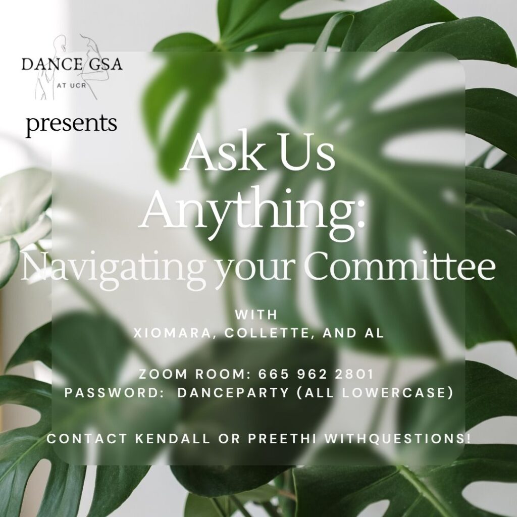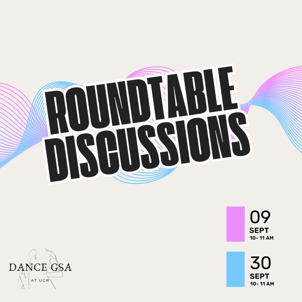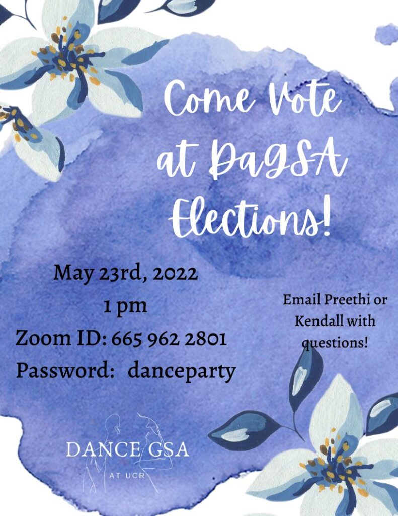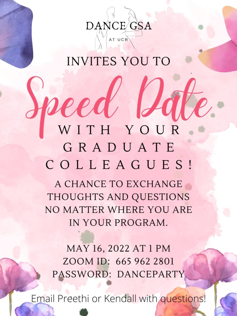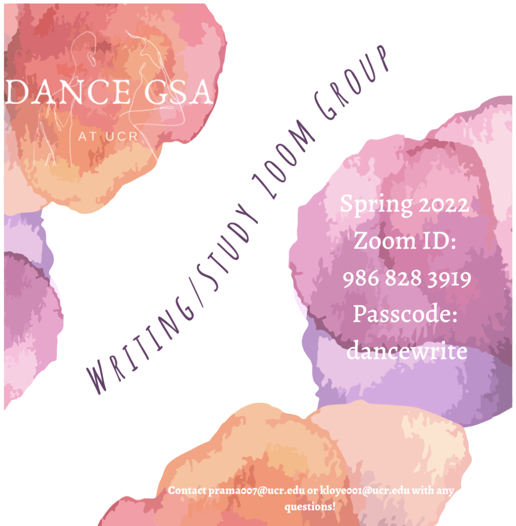The Dance GSA is an association of MFA students in Experimental Choreography and PhD students in Critical Dance Studies at University of California, Riverside. The Dance GSA exists as a social, research, and professional community forum that promotes creative collaboration at the graduate level. Our mission is to foster community within the Department of Dance, and to support and advocate for dance graduate students.