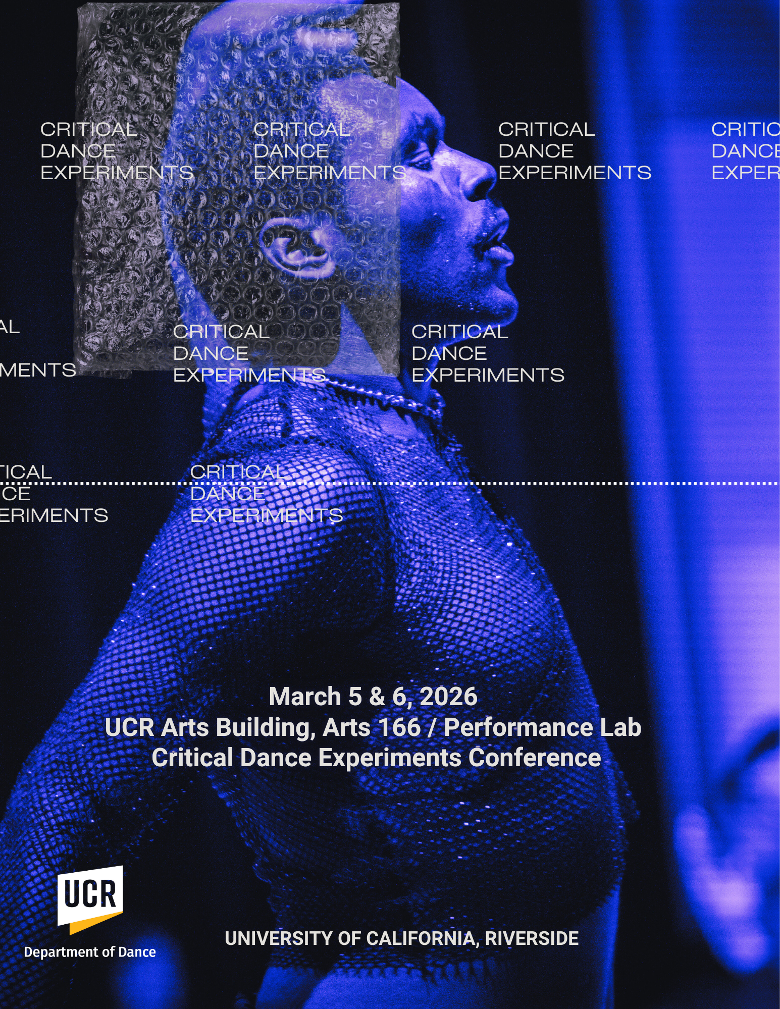 Critical Dance Experiments is a conference organized by MFA and PhD students in UC Riverside’s Department of Dance – it aims to rethink dance scholarship in its multiple forms, at the nexus of theory and praxis, and in response to the urgencies of our shared times and places. We consider flesh in its potential to interrupt, intervene, and/or reimagine an existence otherwise, seeking to address how our embodied practices, choices, and pedagogies as artists, educators and scholars transit between multiple conceptions of what the body is and what dance and performance do, and understanding the need to build coalition not against but through difference.