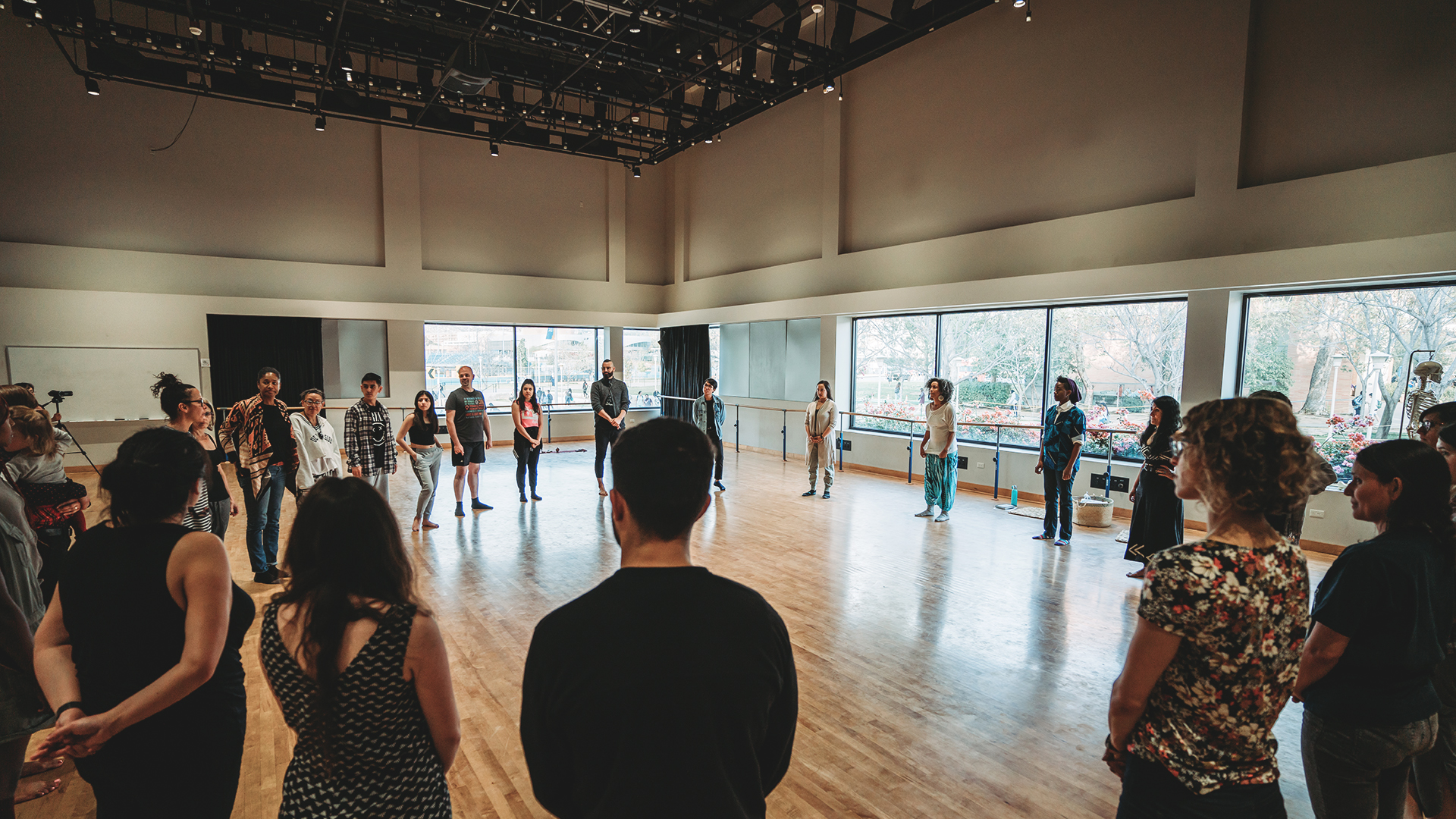 ARTS 100, located in the ARTS Building, is the premier dance studio on campus. Primarily used for movement practice classes, composition, and rehearsal space, it may also be reconfigured for lectures and other movement classes. It is equipped with maple sprung floor, full-length mirrors, retractable curtains, barres, and audio and lighting capabilities. The studio receives plenty of natural light through its many windows, which fronts the promenade from Canyon Crest Avenue to the College of Humanities, Arts, and Social Sciences Building. (Photo Credit: Tanner Sebastian)
