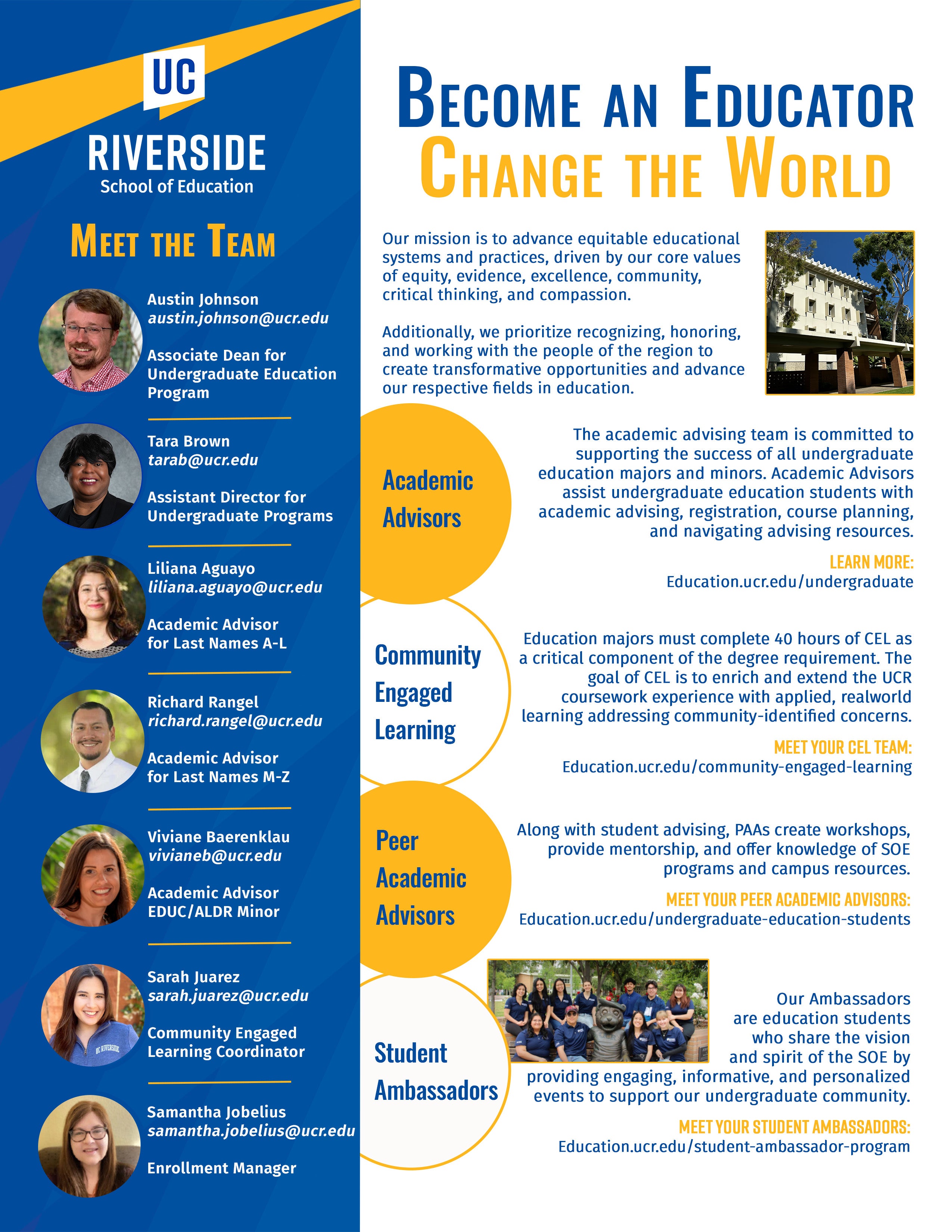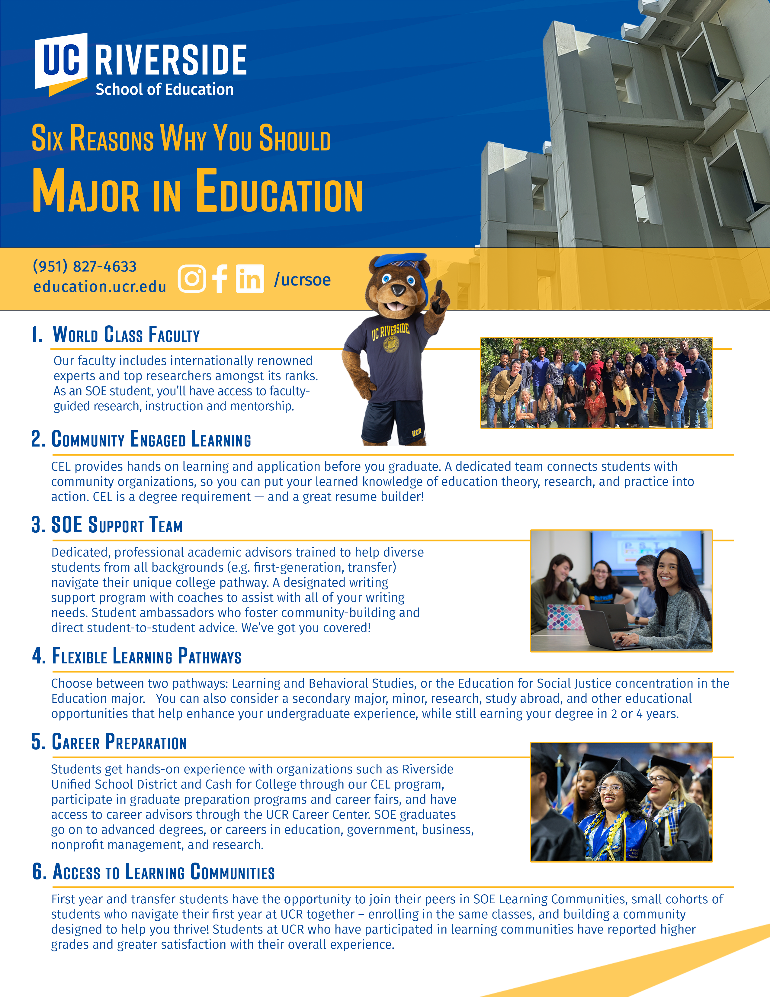 First-Year students enroll into EDUC 093A, EDUC 093B, and EDUC 093C courses during their first year at UCR. The courses are a year-long seminar series designed for first-year students that meets weekly with several aspirations including community building, orientation to the campus and the major, and academic support. The long-term goal of this seminar series is to not only set the foundation for the major but to build an experience that evolves over the course of students’ experience at UCR.