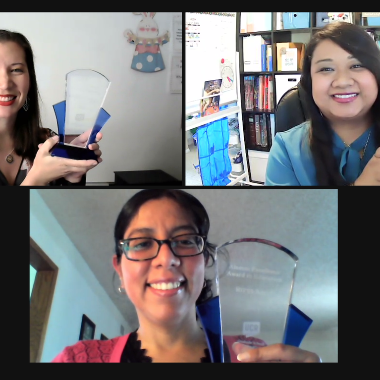 Jennifer Covington and Eleanor Holm, third-grade teachers at Seneca Elementary, and Ritta Aros, a math teacher at Slover Mountain High School, receive the inaugural Alumni Excellence in Education Awards