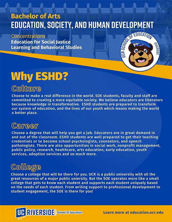The UCR School of Education (SOE) offers a Bachelor of Arts in Education, Society, and Human Development. We call it ESHD. Watch our video to learn more.
