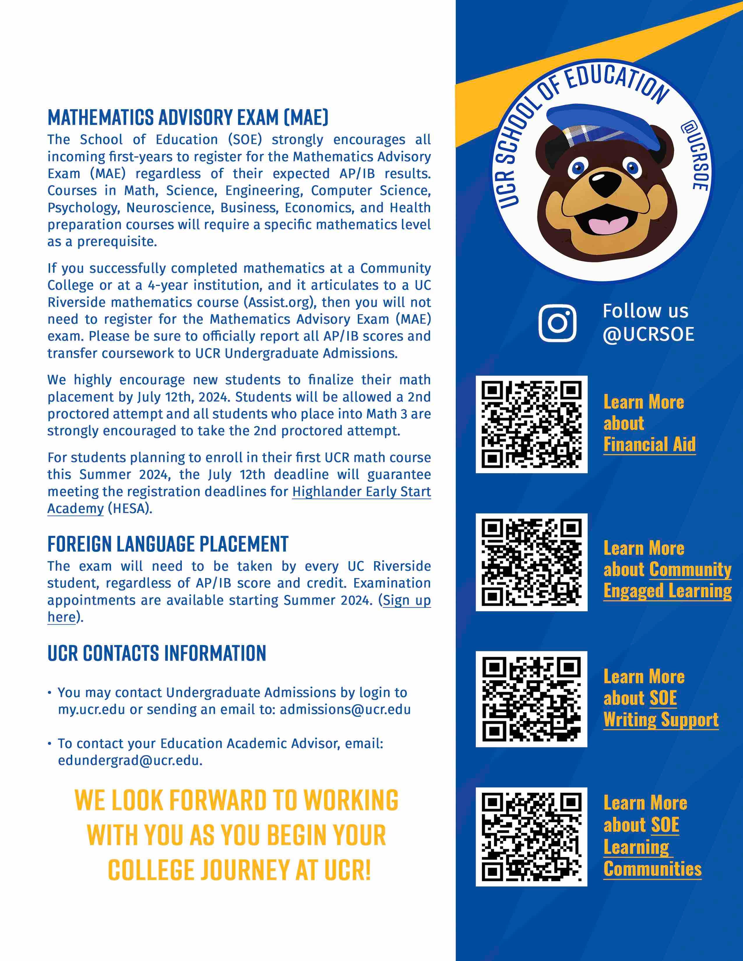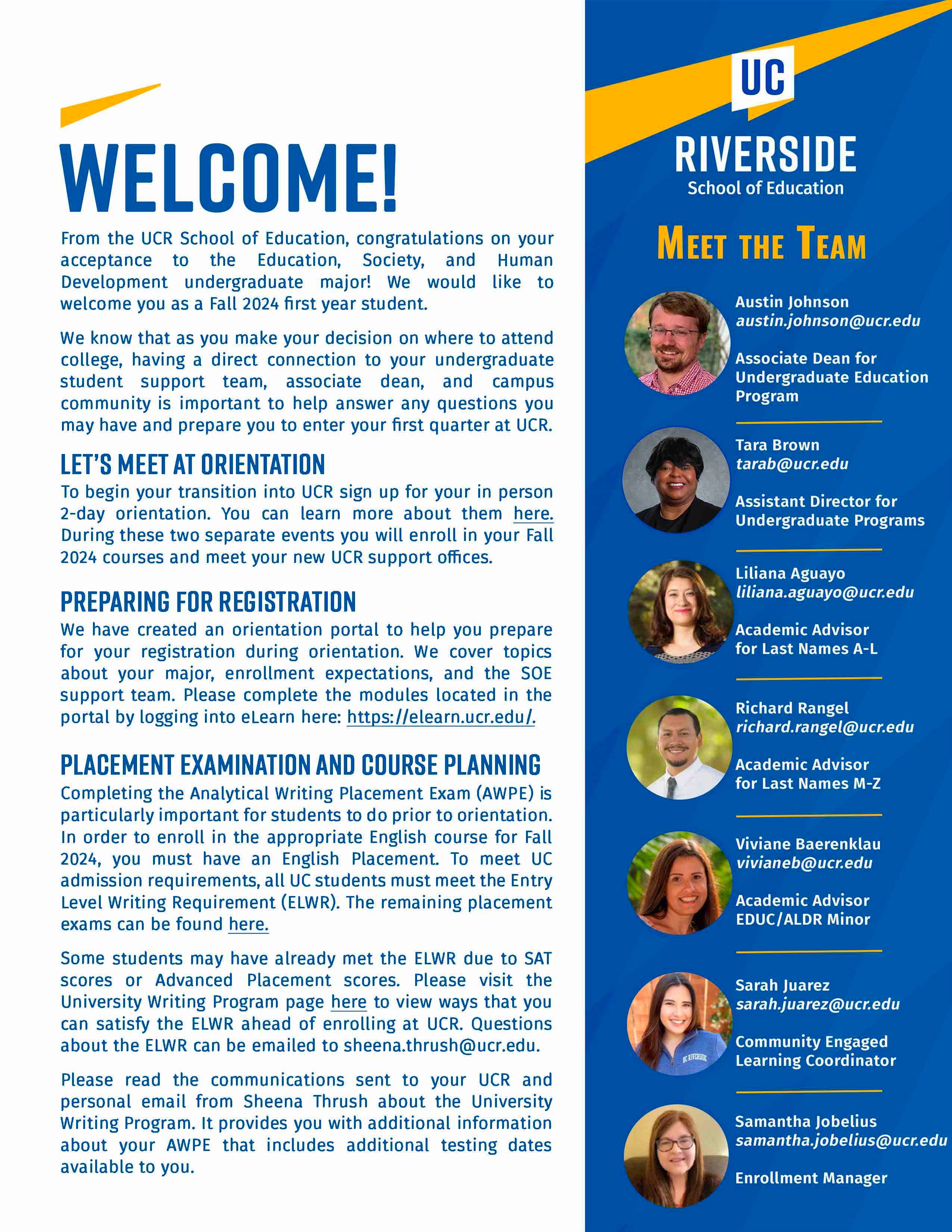 Register here: https://orientation.ucr.edu/During your orientation session, you will learn more about the School of Education and the programs/services in place to help you successfully earn your degree. You will also connect with an academic advisor to confirm your incoming first quarter schedule.Highlander Orientation is mandatory for incoming Education students. SOE will participate in various in persona and virtual orientation sessions during Highlander Orientation on the following dates.