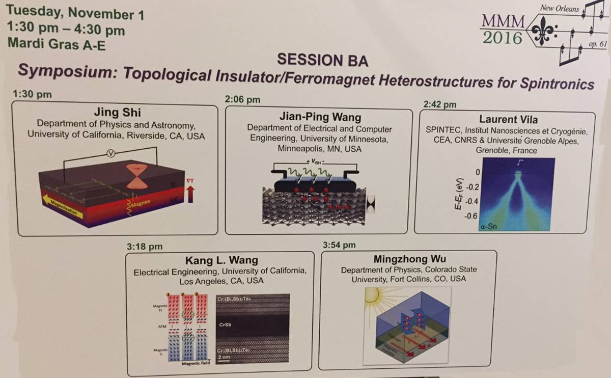 Three SHINES PIs; Prof. Jing Shi, Prof. Kang L. Wang and Mingzhong Wu gave invited talks for the symposium titled “Topological Insulator/ Ferromagnet Heterostrctures for spintronics” at MMM 2016 held in New Orleans-Louisiana.
