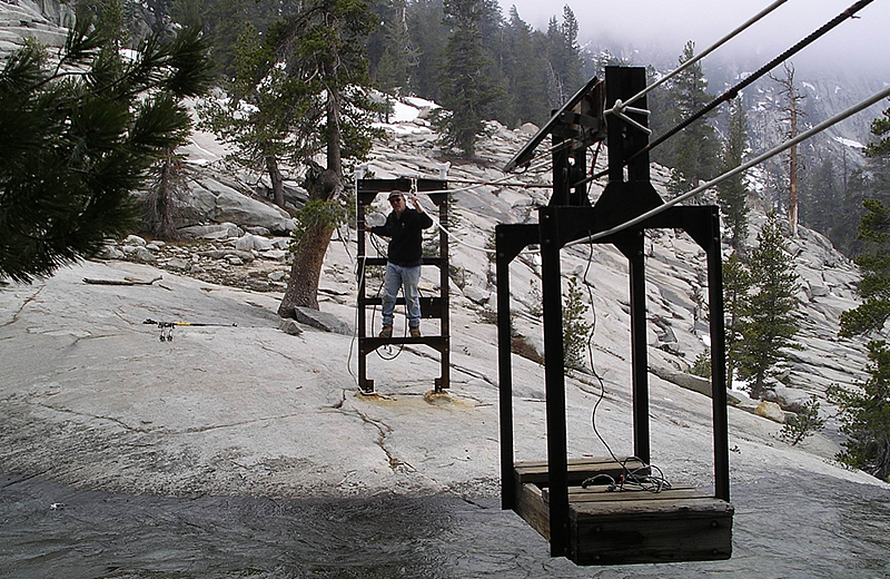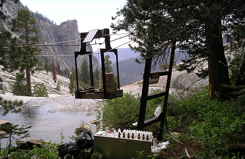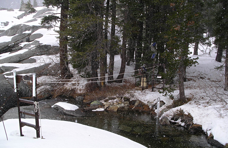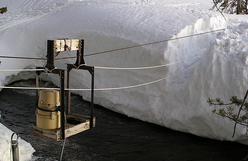 Discharge from the upper Marble Fork of the Kaweah basin is gauged at the Marble Fork station which is located about 1-km up-river from Tokopah Falls. A rating curve is computed from periodic measurements of discharge made from the cable car and other methods. This gauging station is jointly maintained by the University of California, National Park Service and the U.S. Geological Survey. GOES satellite telemetry was added in 2004.