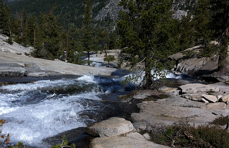 Brook trout have been observed in the Marble Fork River but appear to be restricted to reaches below the confluence of the Pear Lake outlet. Just above this confluence the bed of the river is composed of steep, smooth bedrock. Rapid and turbulent flows occur during snowmelt and under low-flow conditions the river fans out over the rock surface, reducing water depths to just a few centimeters. These conditions preclude the migration of trout upstream and may partially explain the lack of fish in the upper reaches of the river and at Topaz and Frog lakes.