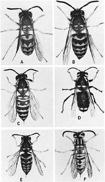 Fig.226. Western yellowjackets. A, Vespula pensylvanica; B, Vespula vulgaris; C, Vespula atropilosa; D, Vespula maculata; E, Vespula arenaria; F, Vespula sulphurea. (All species have yellow markings on a black background except Vespula maculata, which has white markings.)