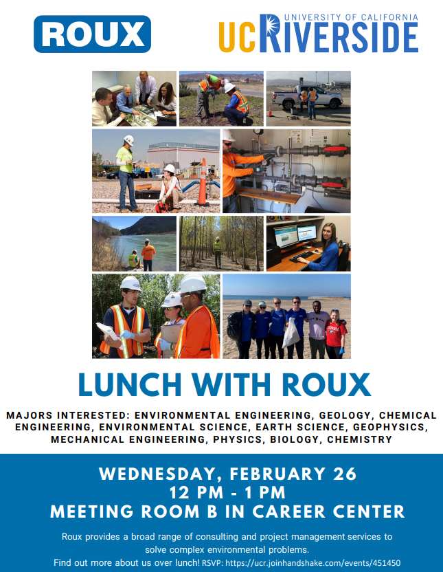 Roux @RouxAssociates is seeking to hire UCR students majoring in environmental engineering, geology, chemical engineering, environmental science mechanical engineering, physics, biology, and chemistry. Read more and RSVP.