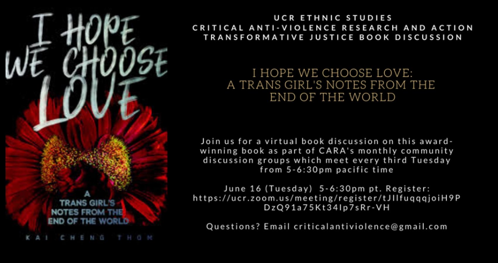Join ETST’s Critical Antiiviolence Research and Action for its monthly Transformative Justice book discussion, I Hope We Choose Love: A Trans Girl’s Notes From the End of the World by Kai Cheng Thom