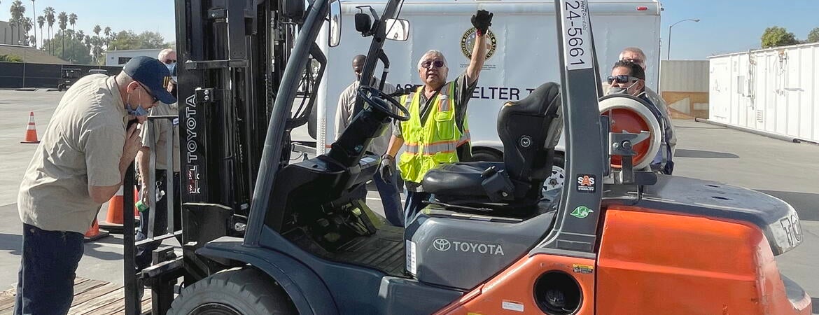 Hands-on vehicle training and skills assessment took place in the EH&S loading dock area on equipment rented specifically for the training. Orange traffic cones were setup in a measured obstacle course for staff to practice and test for final certification.