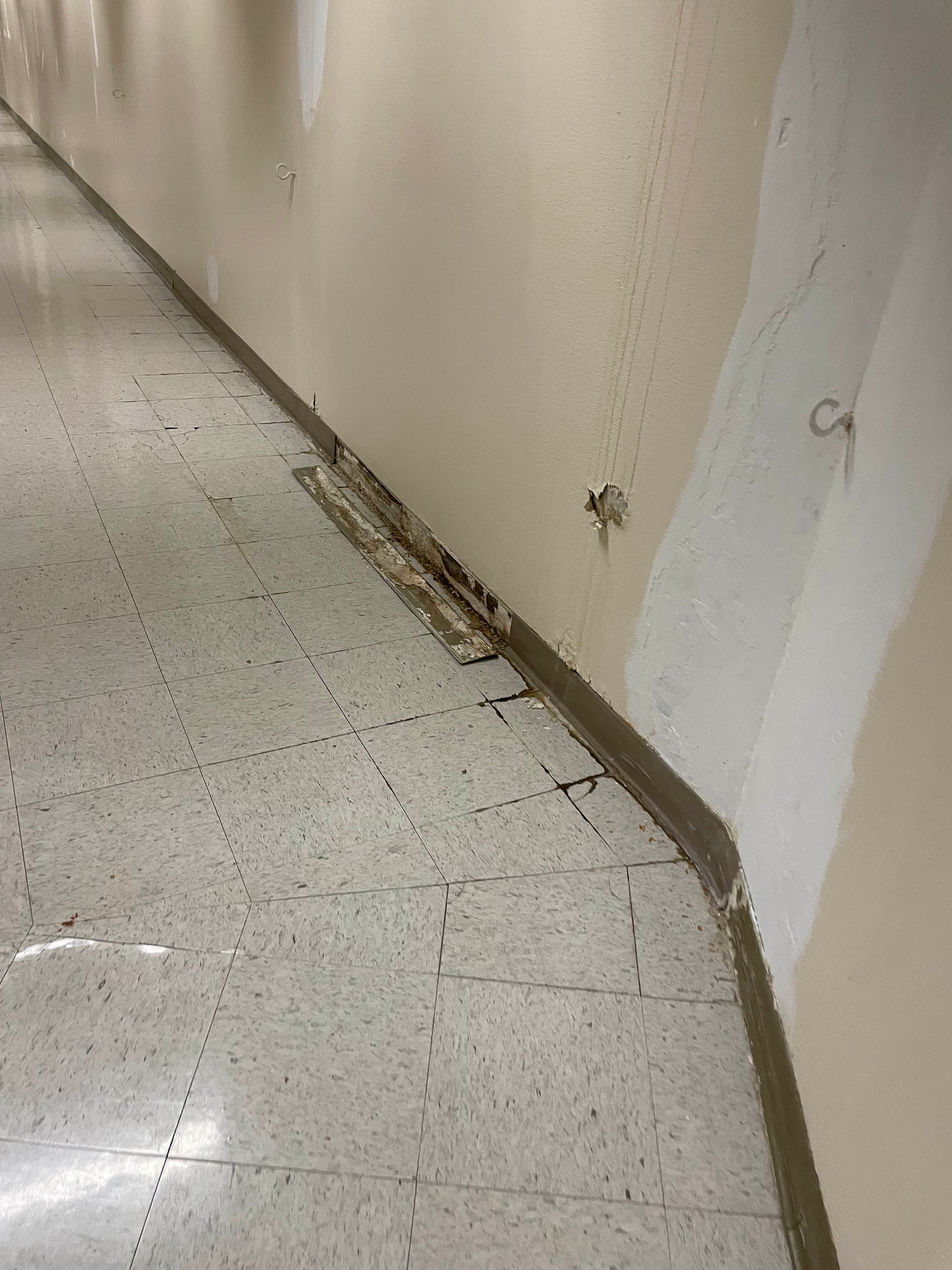 Facilities Services started with abating and encapsulating the walls. This included scraping and sanding off flaking paint and encapsulating it with a special formula paint. Most stairwells and common areas are now primed and painted. Cove bases are currently being replaced along with any missing ceiling tiles.