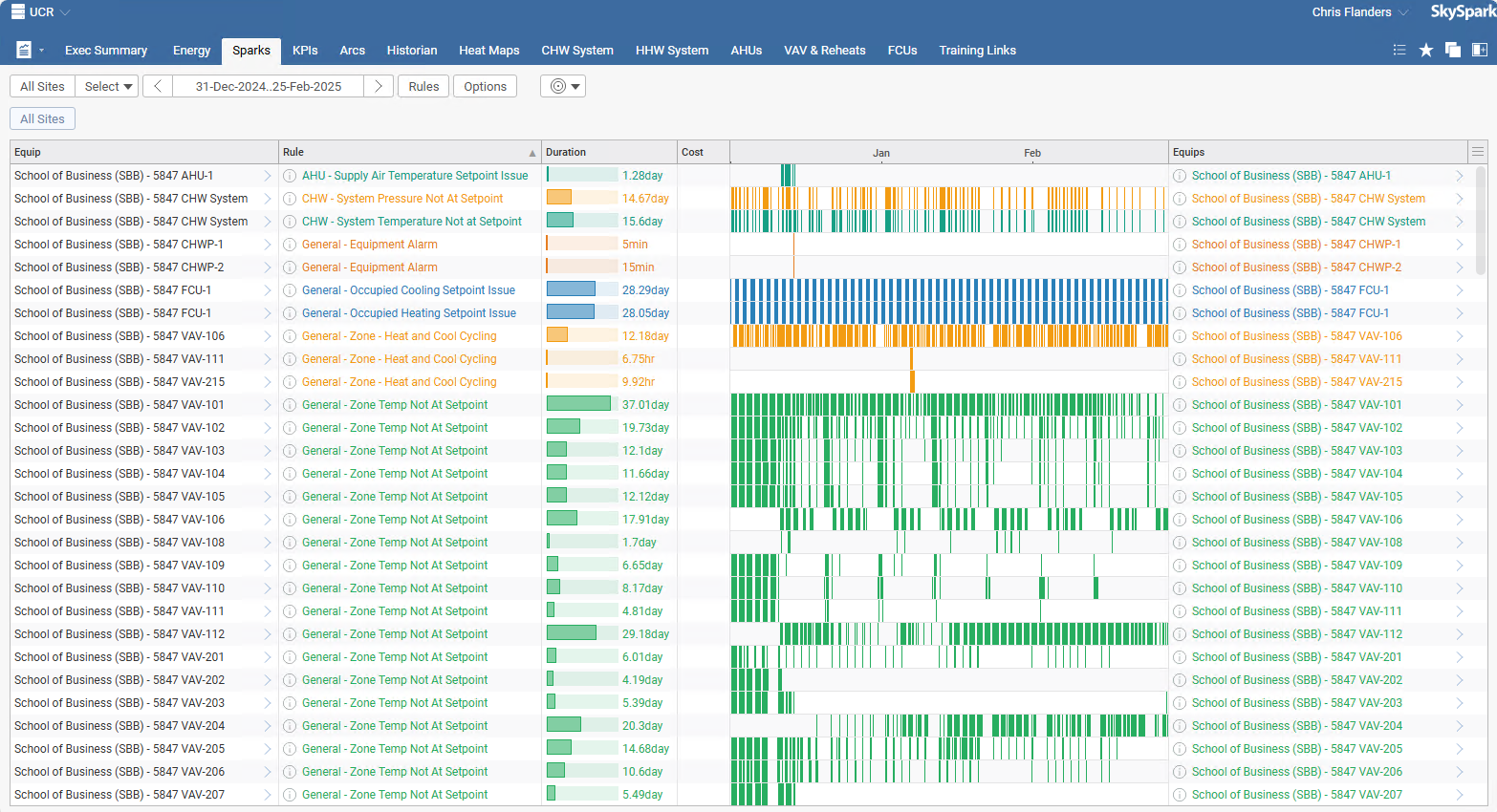 The software identifies what are known as "sparks," which are anomalies detected using algorithms. This data is reported monthly, allowing Facilities Services to create work orders and actionable items based on the analysis. Over the last month, the software has already generated a list of action items related to air flow, heat recovery, chilled water valves, and dampers, some of which fall under warranty and require manufacturer assistance.