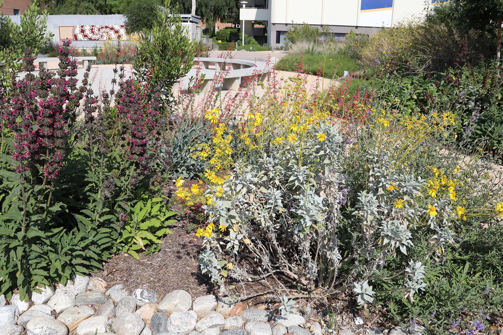 UC Riverside’s Native American Garden, installed in April 2024, is now bursting into full bloom. This vibrant display of native California flora features species carefully selected to reflect the traditions and natural environment of the Cahuilla, Tongva, Luiseño, and Serrano peoples—tribes native to the region. During the planning process, the university’s Landscape Services team provided input on the plant materials chosen by the project committee.