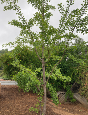 We are left today with simply a beautiful tree, and one symbolic in the past of romantic love. Its delicate foliage is a delight to see, and especially when it turns a brilliant yellow in autumn. It has been cultivated in many aristocratic gardens, including that of Goethe himself. It is especially revered for its longevity, with some trees dating back at least 1,000 years, and for its capacity to survive and prosper in adverse conditions. The Botanic Gardens has two mature trees along the main drive in the Temperate Deciduous Forest area and a lovely young specimen near the upper restroom.