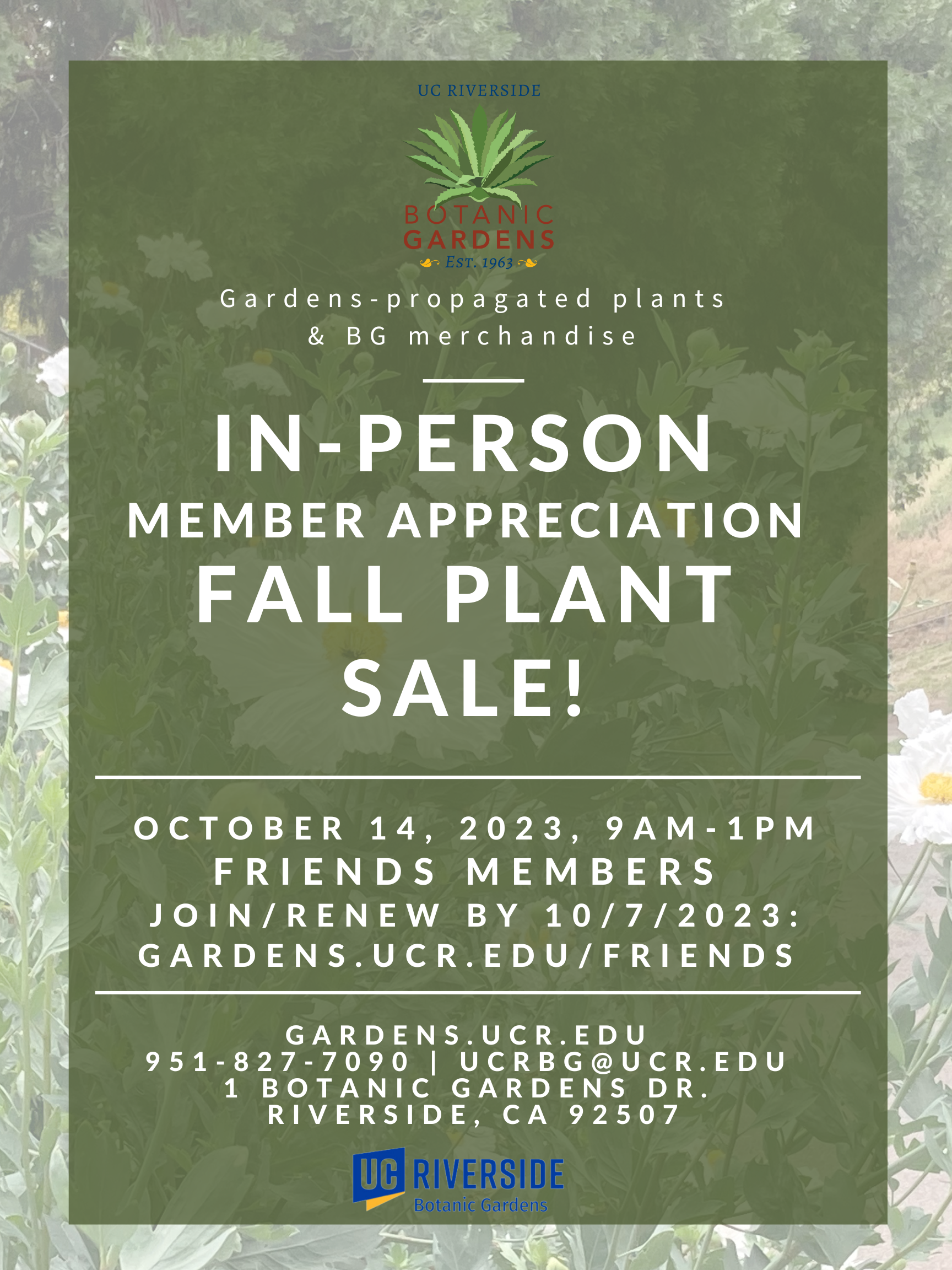 Friends members will enjoy admission at the in-person plant sale, as well as many other benefits described under “Become a Member.” To become or renew as a member visit myadv.ucr.edu/forms/UCRBG