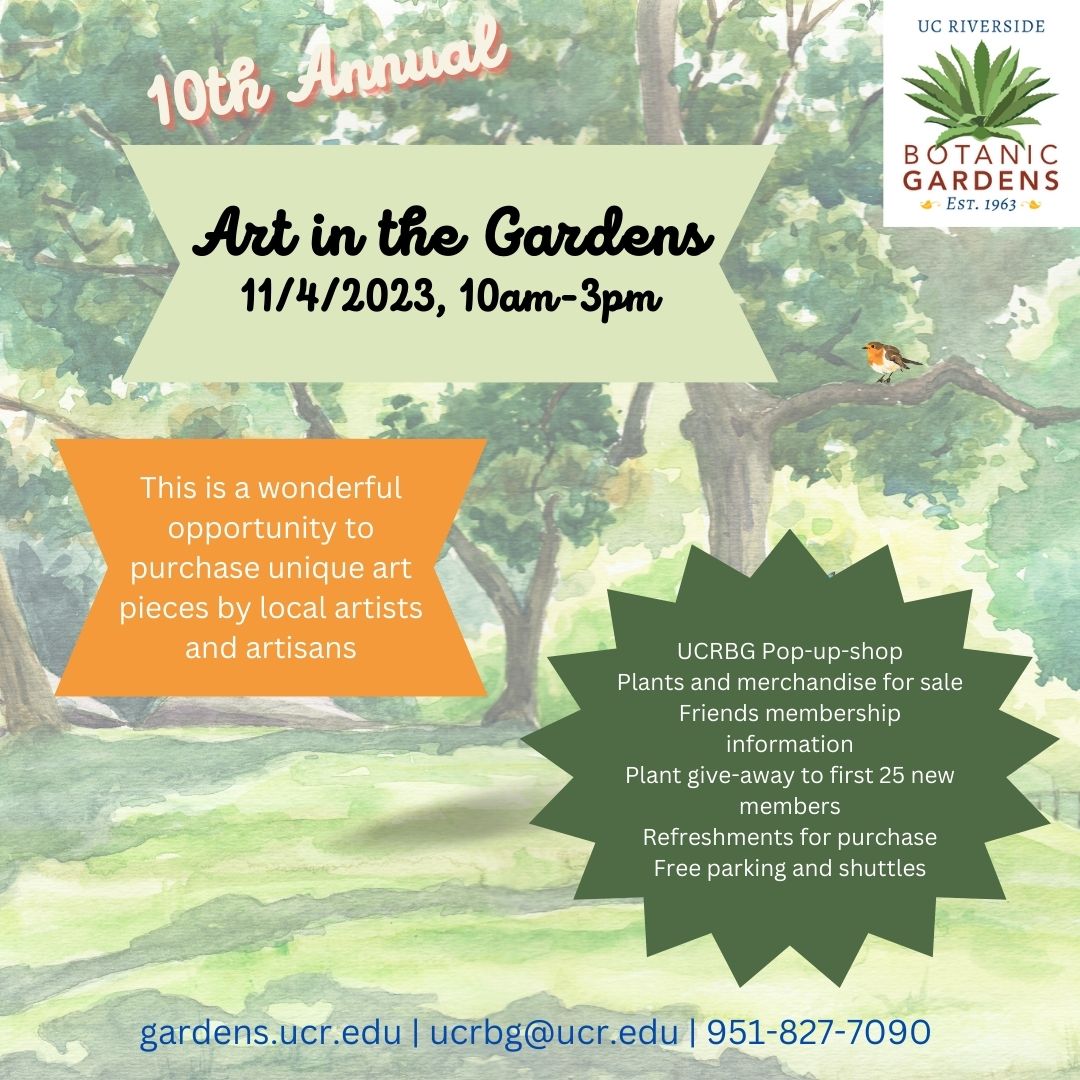 Every November the UCR Botanic Gardens hosts an outreach event where curated items from local artisans are offered for sale. Come spend a pleasant afternoon strolling through Alder Canyon, where California artists and craftspersons are showcased representing a variety of media including ceramics, jewelry, mosaics, metal work, fiber arts, wood, and photography. Art in the Gardens is a great opportunity to shop from local artists while supporting the programs and activities of the UCR Botanic Gardens.