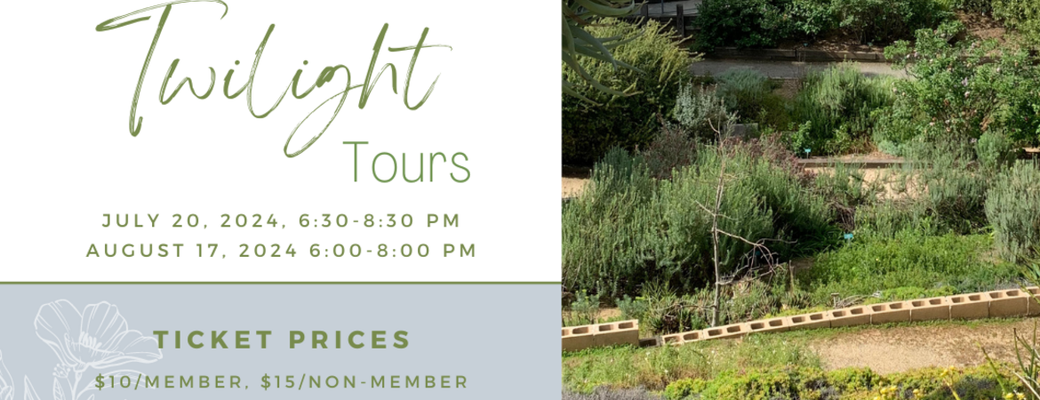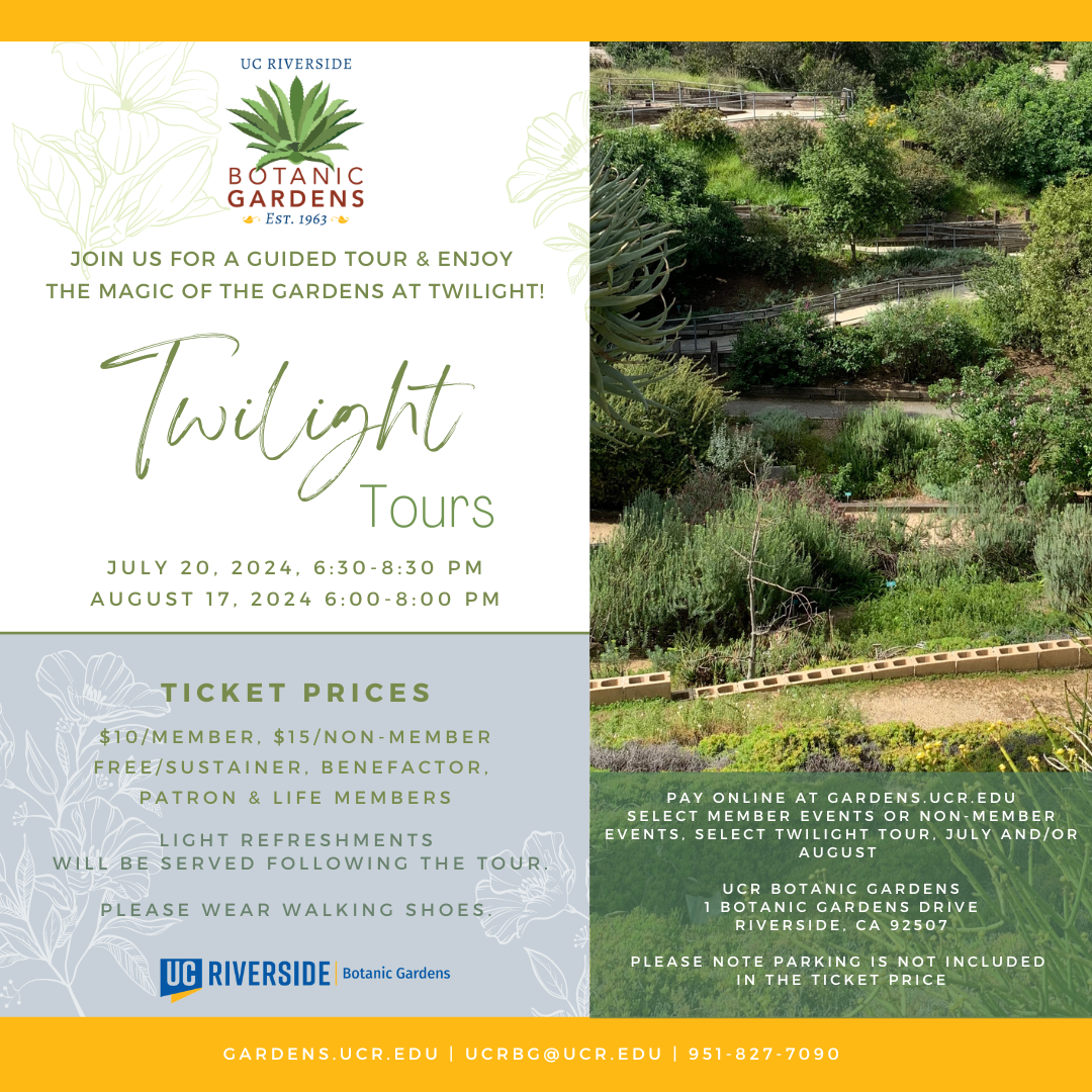 These events usually fill quickly, so purchase your tickets early: gardens.ucr.edu Click PAY ONLINE, select MEMBER EVENTS or NON-MEMBER EVENTS, select August Twilight Tour.