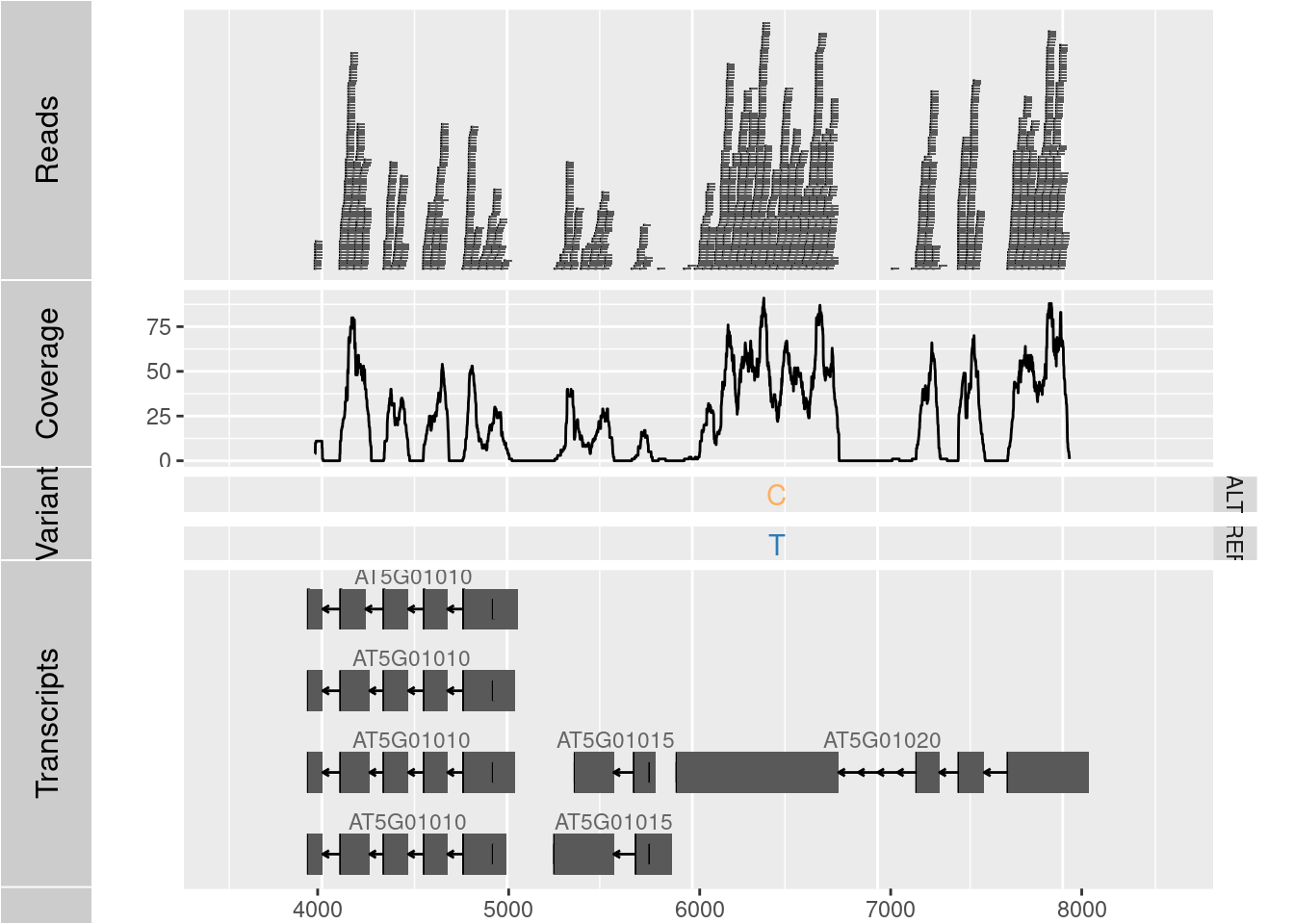 The ggbio package (Yin, Cook, and Lawrence 2012) facilitates plotting of complex genome data objects, such as read alignments (SAM/BAM), genomic context/annotation information (gff/txdb), variant calls (VCF/BCF), and more. To easily compare these data sets, it extends the faceting facility of ggplot2 to genome browser-like tracks.