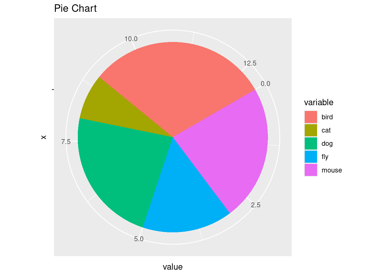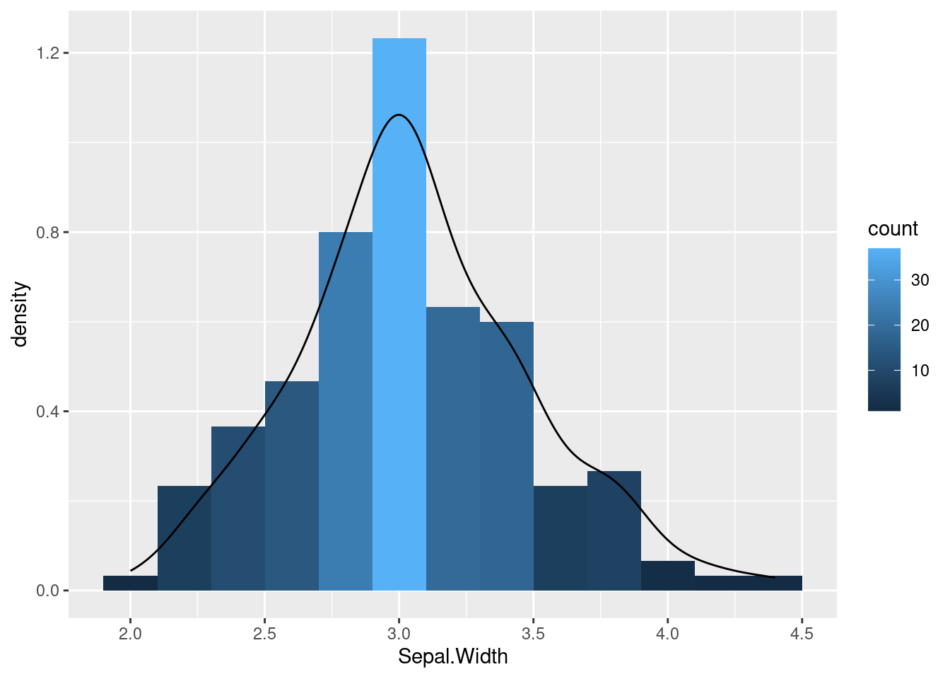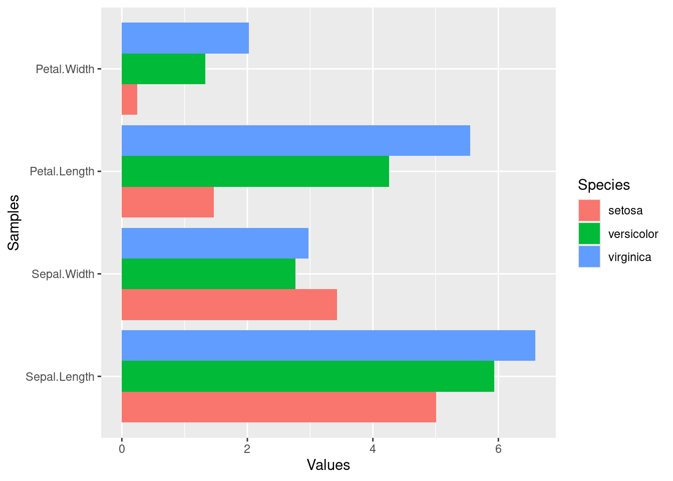Reformat iris_mean with melt from wide to long form as expected by ggplot2. Newer alternatives for restructuring data.frames and tibbles from wide into long form use the gather and pivot_longer functions defined by the tidyr package. Their usage is shown below as well. The functions pivot_longer and pivot_wider are expected to provide the most flexible long-term solution, but may not work in older R versions.