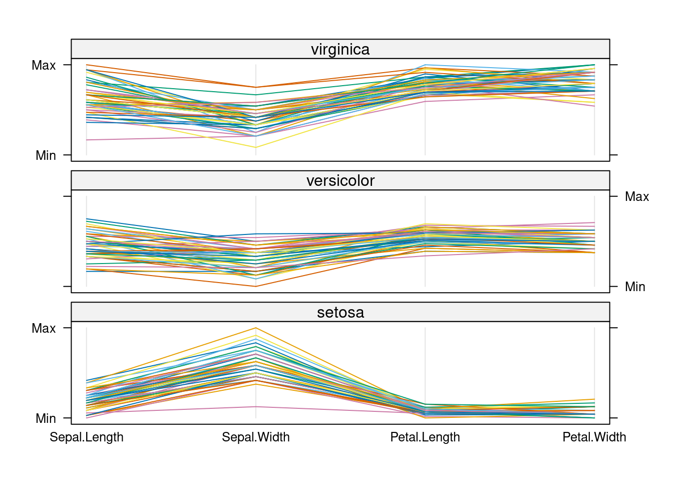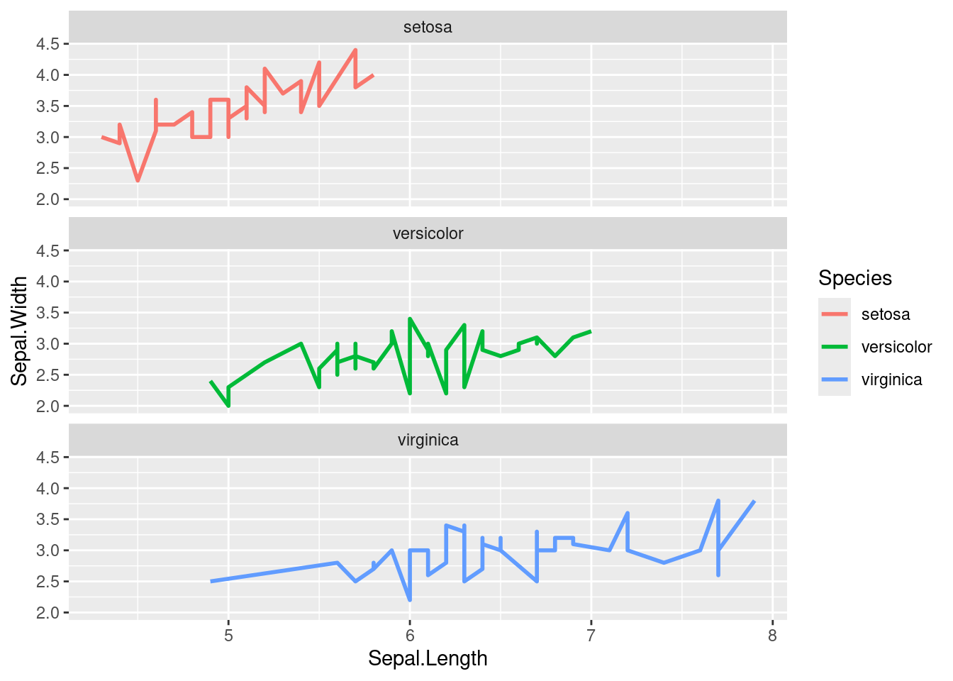 p <-ggplot(iris, aes(Sepal.Length, Sepal.Width)) +geom_line(aes(color=Species), size=1) +facet_wrap(~Species, ncol=1)print(p)