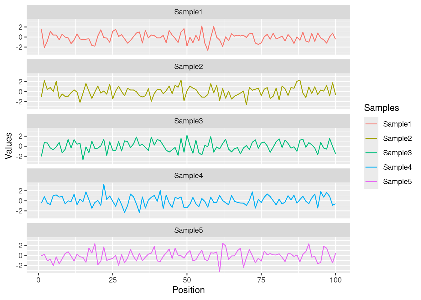 y <-matrix(rnorm(500), 100, 5, dimnames=list(paste("g", 1:100, sep=""), paste("Sample", 1:5, sep="")))y <-data.frame(Position=1:length(y[,1]), y)y[1:4, ] # First rows of input format expected by melt()