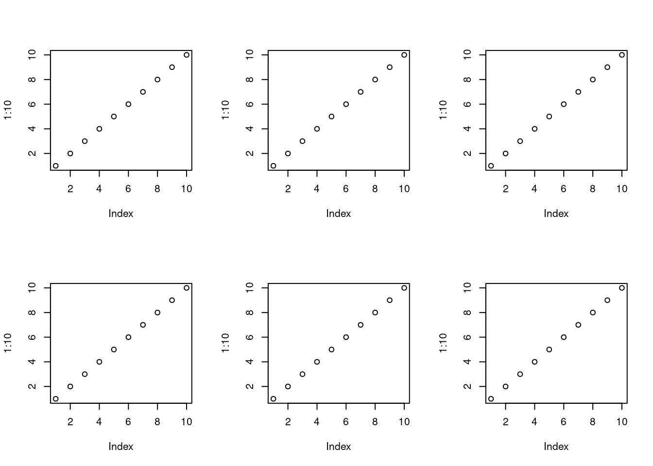 par(mfrow=c(2,3)) for(i in1:6) plot(1:10)