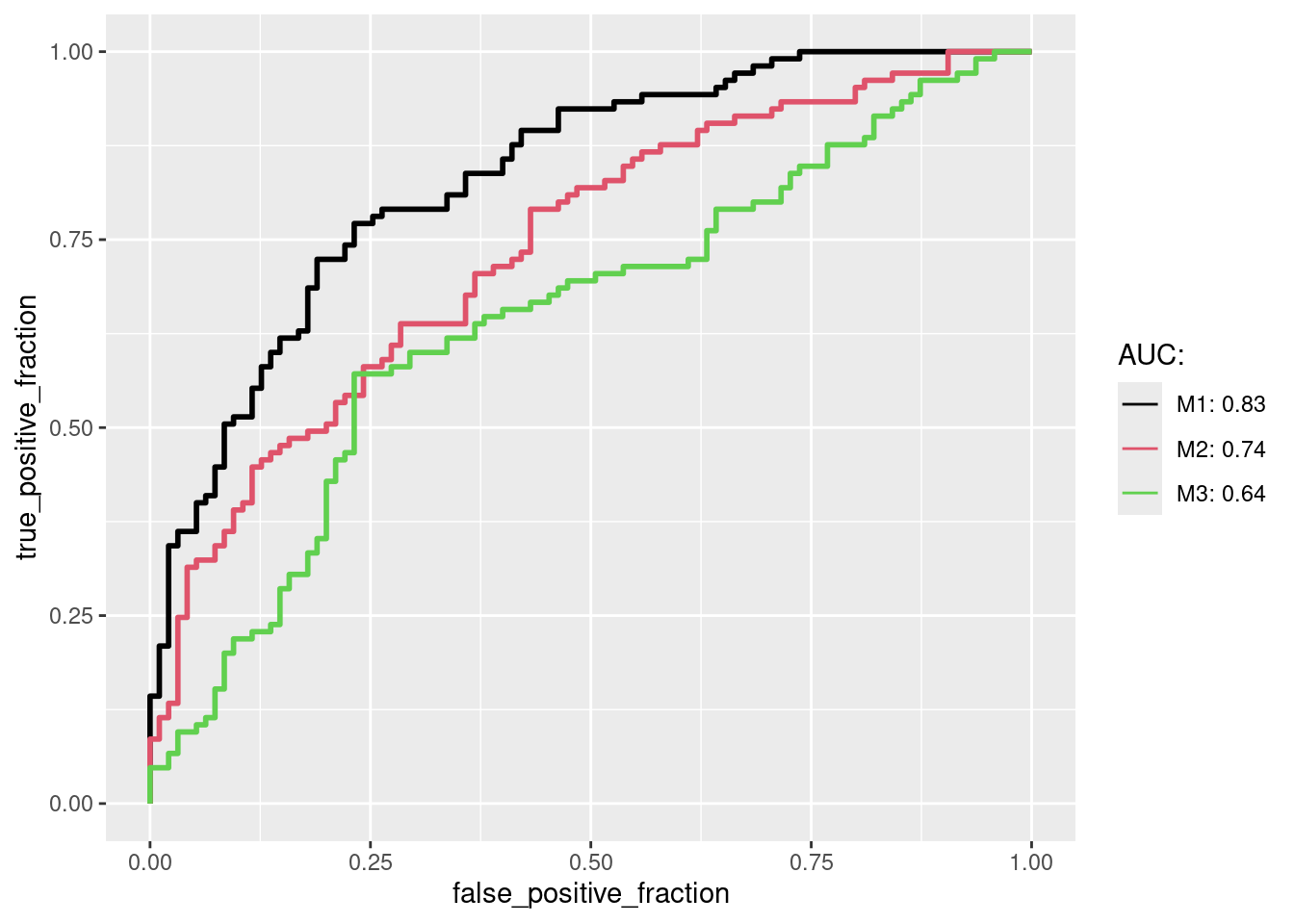 long_perfDF <-melt_roc(perfDF, "D", c("M1", "M2", "M3")) # transformed into long format for ggplotlong_perfDF[1:4,] # long format