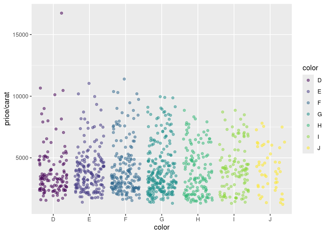 ggplot(dsmall, aes(color, price/carat)) + geom_jitter(alpha = I(1 / 2), aes(color=color))