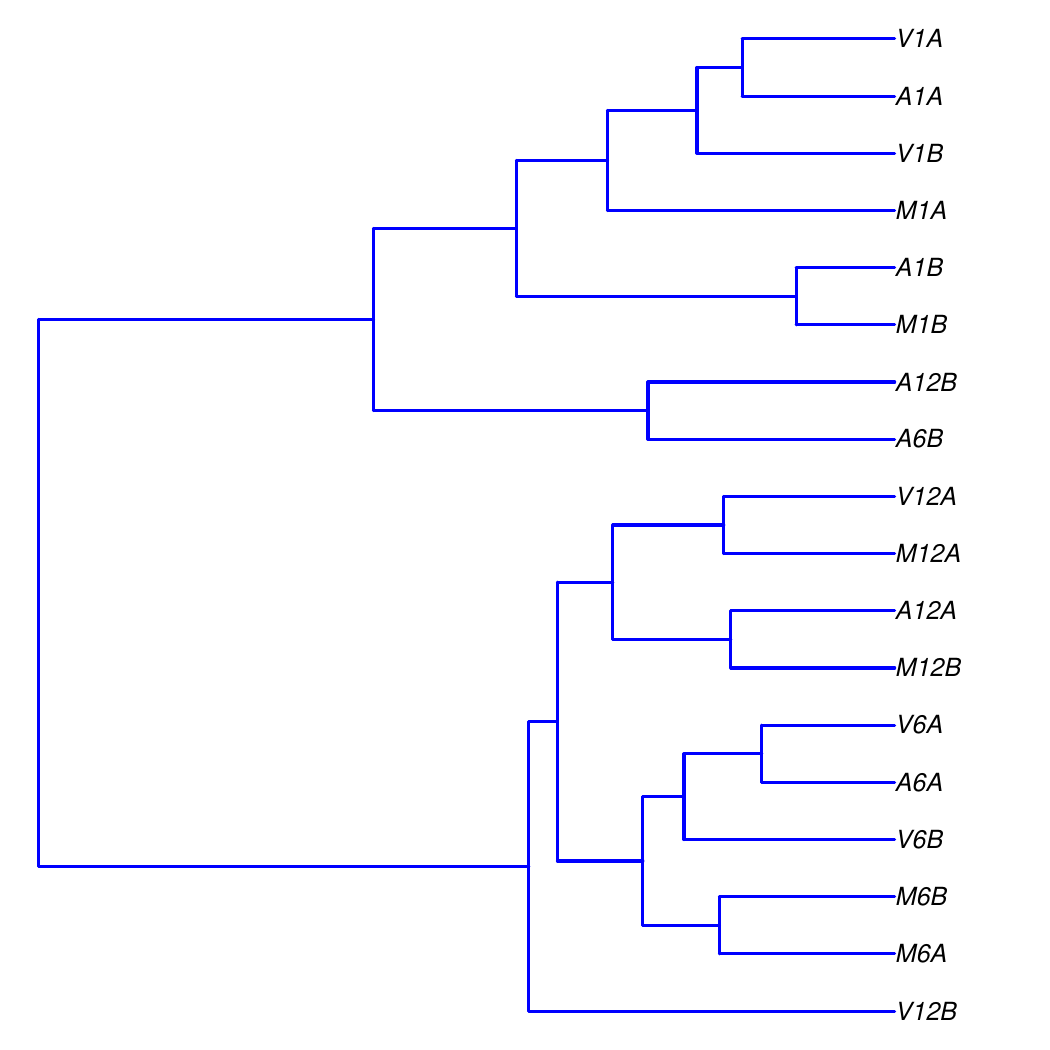 The following example performs hierarchical clustering on the rlog transformed expression matrix subsetted by the DEGs identified in the above differential expression analysis. It uses a Pearson correlation-based distance measure and complete linkage for cluster joining.