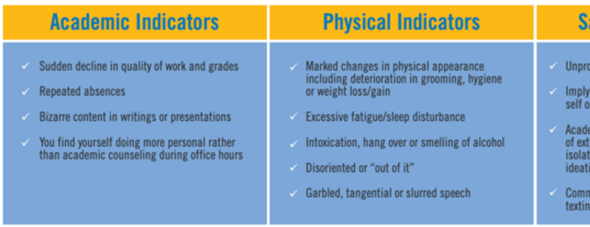 The first step in recognizing if a student needs help is simply to be aware of your students’ behaviors. Students often do not reach out and ask for help when they need it. Thus, recognizing unusual or inappropriate behavior is critical. For example, when TAing or mentoring, we tend to have frequent contact with students. If we are aware of the standard behavior of our students, we may be able to see changes or distress when they present in behavioral changes in a student. If you notice something is going on with a student, it is important to be proactive and trust your instincts. Try reaching out to the student and talking to them privately. Some things that you can address with them are 1) your concern, 2) progress in the course, 3) whether they need help or want to talk about anything (course related or personal), and 4) campus and other resources.